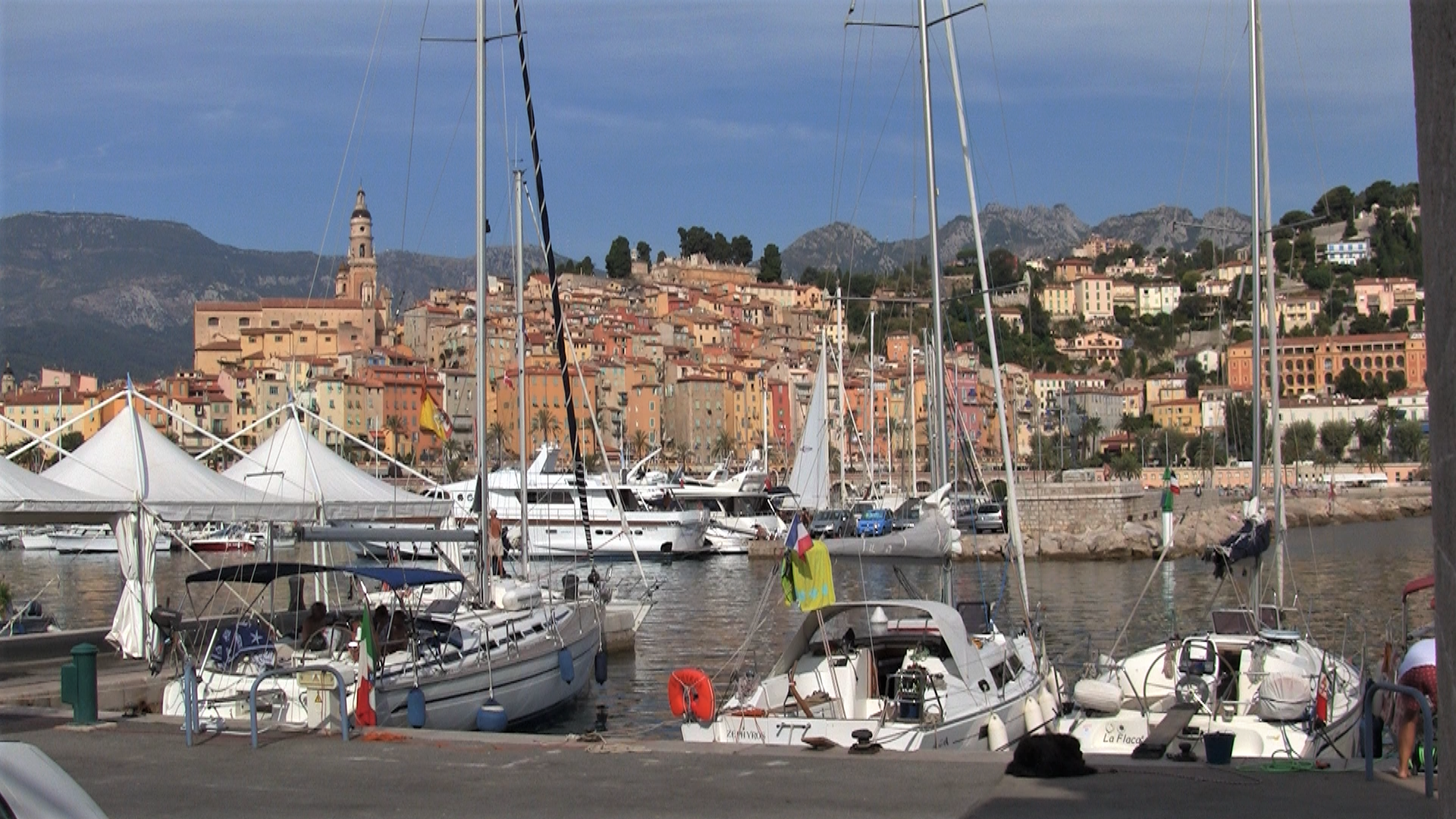 MENTON ! Une très belle bourgade, avec un très beau cimetière marin, mais y'a peu de place dans le port... Souvent, c'est presque mieux d'aller directement au port de GARAVAN juste au Nord Est du vieux port de MENTON. C'est mieux protégé que d'être en bout de quai et moins cher aussi !