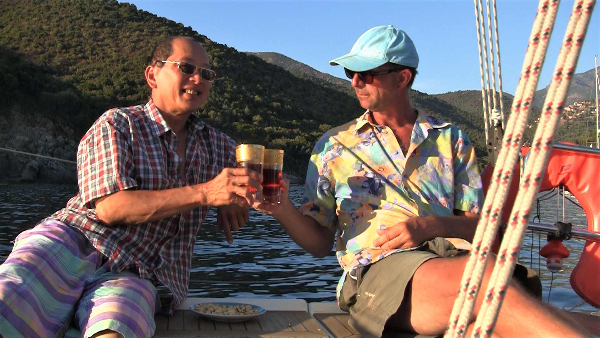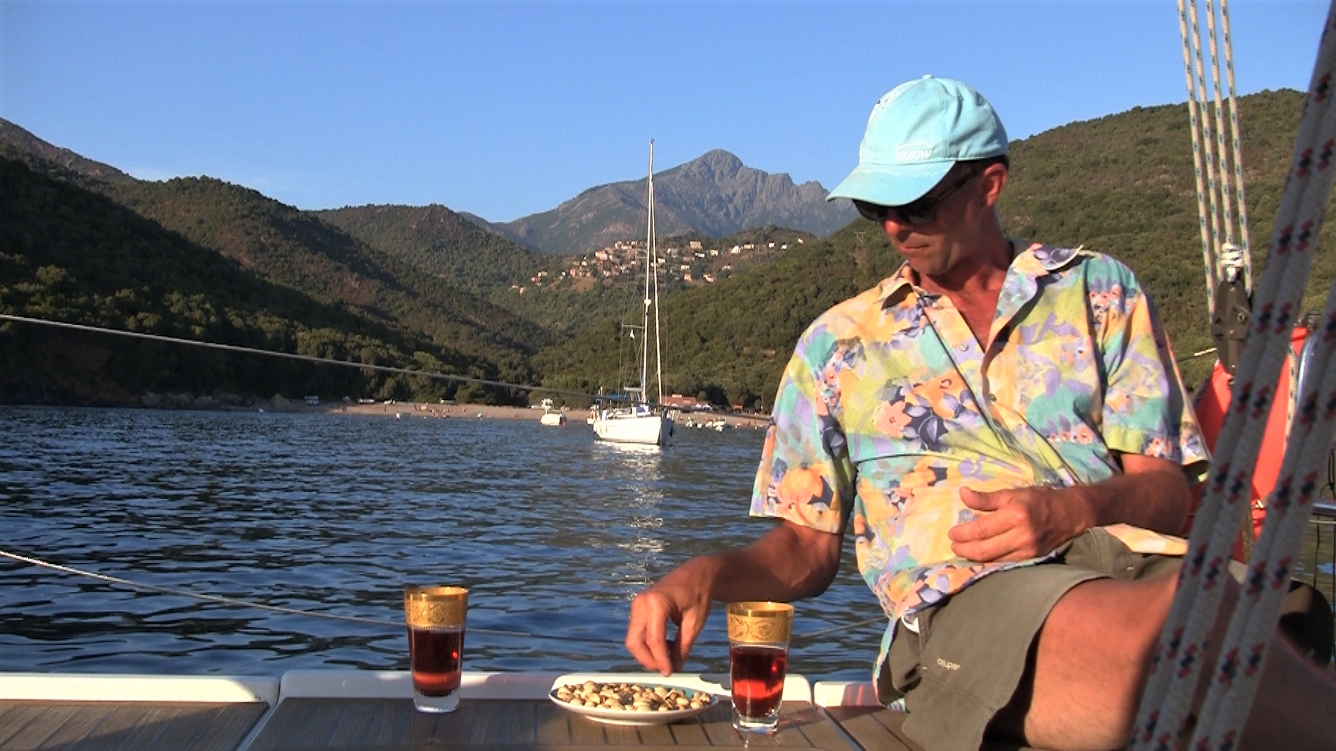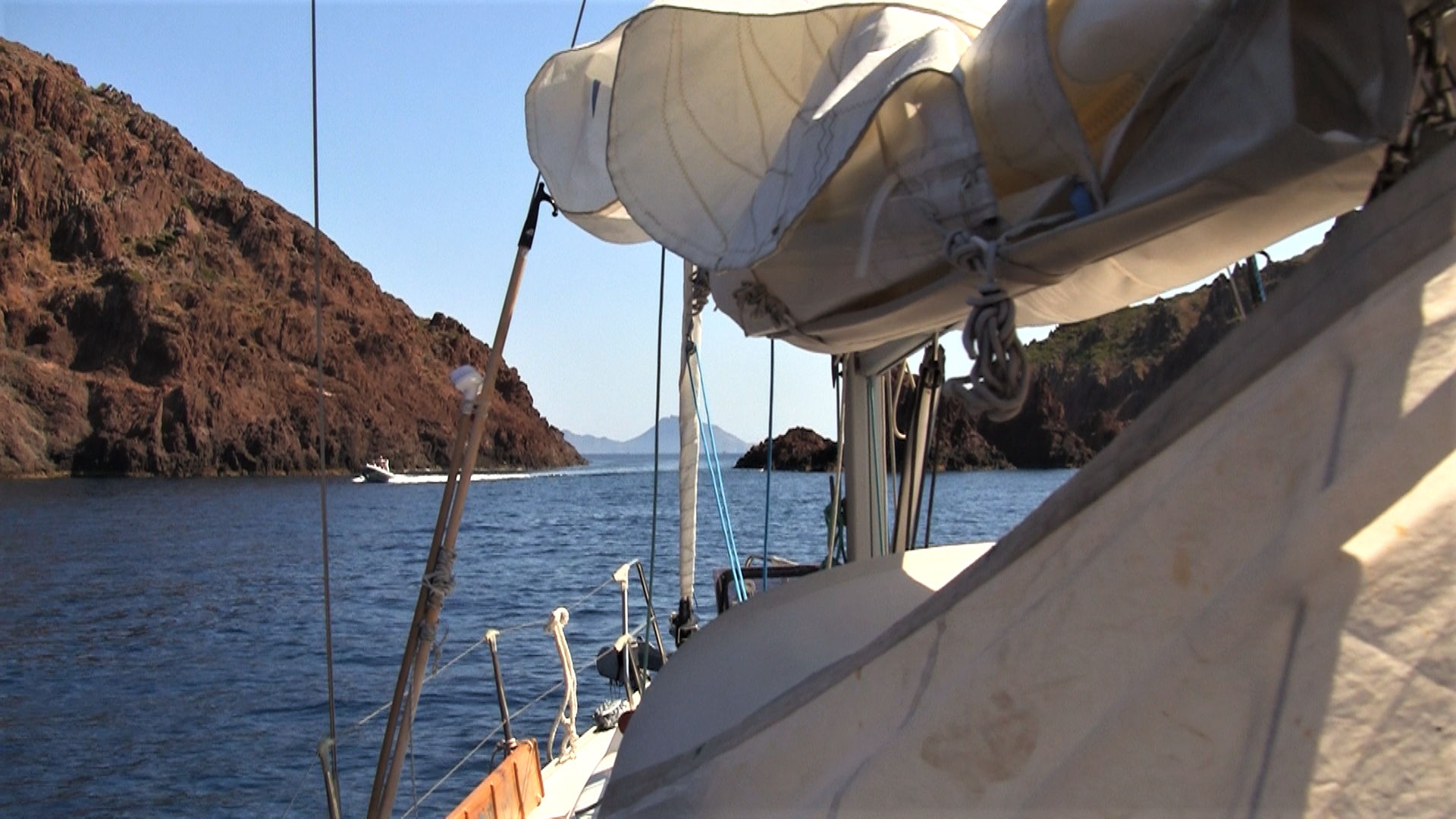 On s'trouve un coin à l'écart pour jeter l'ancre par une 20taine de mètres ! A l'époque, je n'oringuais jamais !!! Faut espérer que c'coup là, l'ancre ne va pas se trouver un trou de roche et y rester coincée ! Ça me rappelle... Avec Philippe, le cousin... Une zone de mouillage sur l'île d'ELBE. Y mouille, le cousin... Et ben il la mise pile dans le seul trou de toute la zone de mouillage ! Faut l'faire, hein ? Il a bien fallu qu'il plonge ! Et profond en plus !