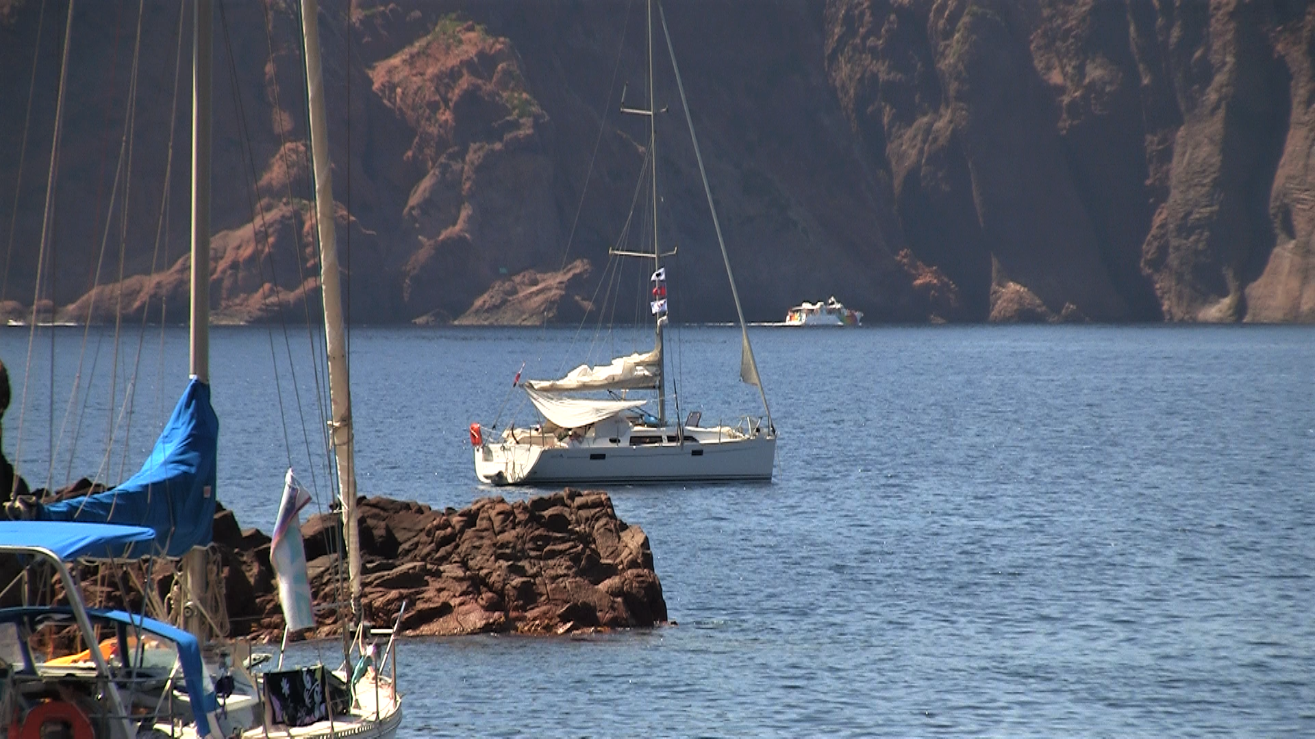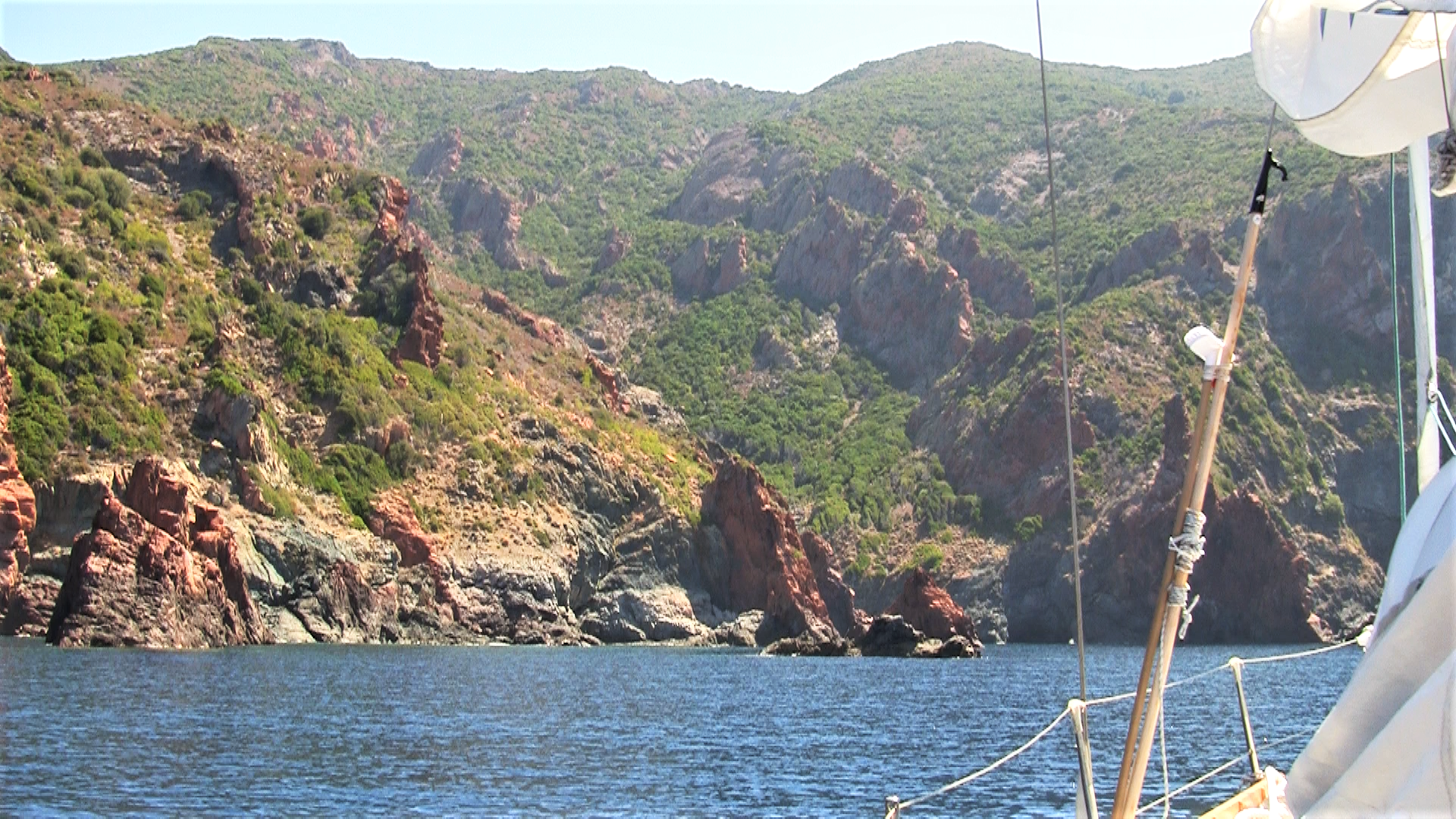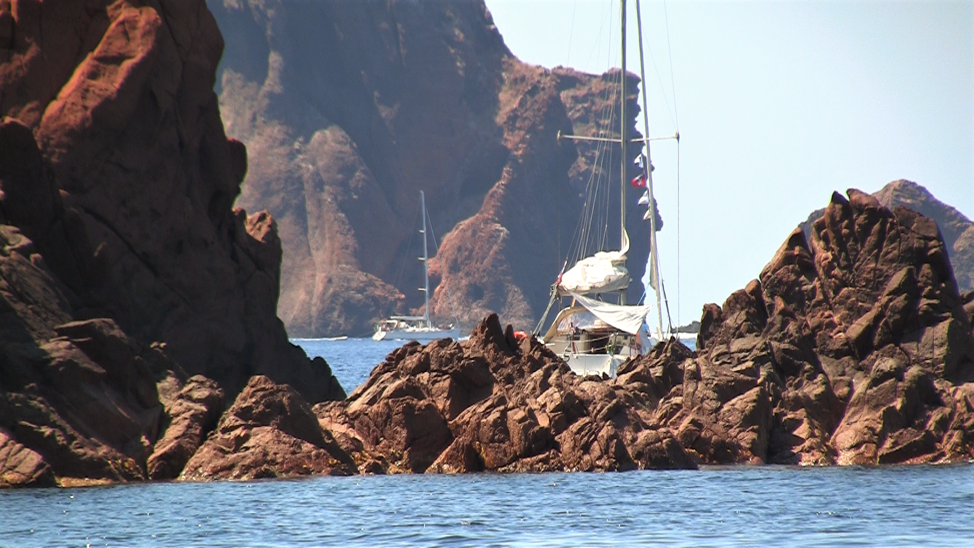 Halte devant le ravin de CANALETTE dans la baie d'ELBO. Tu as le droit de t'y arrêter, mais tu n'as pas le droit de débarquer sur la plage. Normalement !... Dans la réserve de SCANDOLA, c'est, normalement, le seul point de mouillage autorisé !
