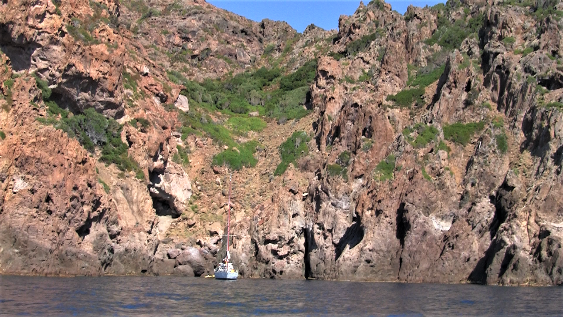 C'est aussi à cause ou grâce à ces fonds sans fond qu'on peut se faufiler, avec le ZEF, dans l'étroit passage entre l'île di GARGALU et la côte ! On est en plein dans l'ancienne caldeira ! GARGALU, c'est un mélange de lahars (dépôt de roches provenant de la re-sédimentation des matières issues des coulées pyroclastiques !) et de ignimbrites (roches formées de débris de lave provenant d'une nuée ardente) ! C'est dire si on est en plein d'dans !
