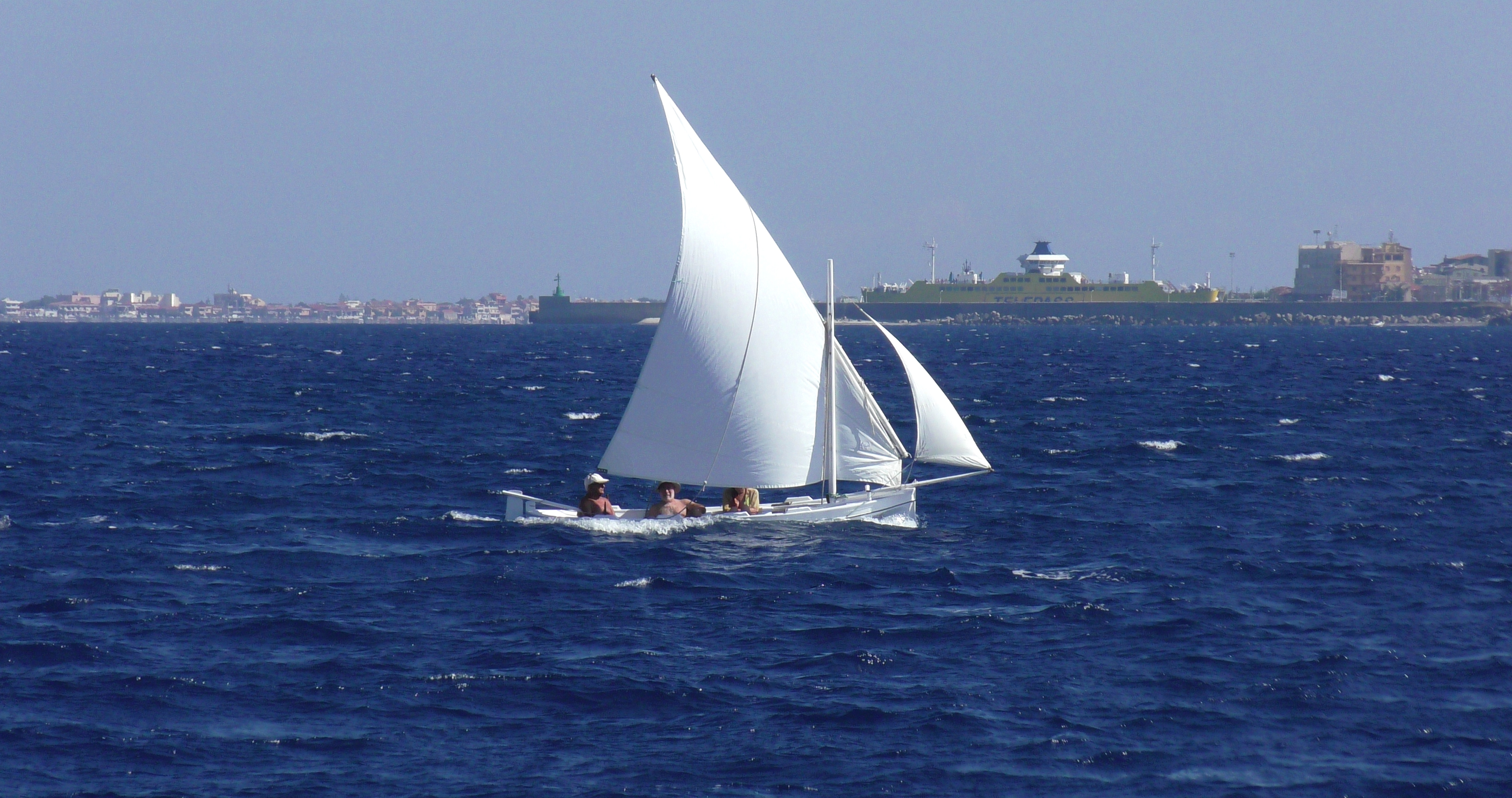 Dans le détroit, une barque à voile cingle d'une rive à l'autre.