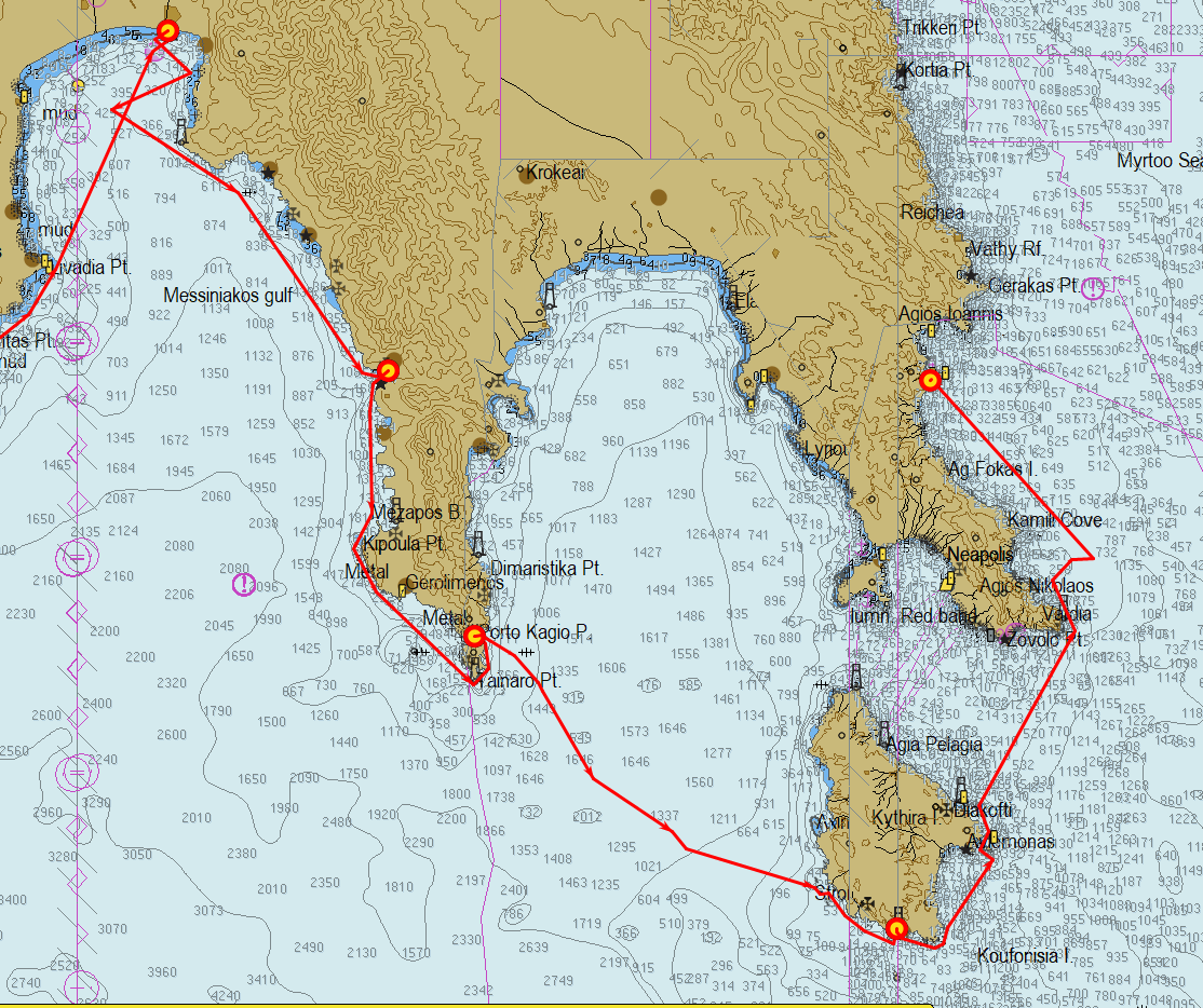 On a fait un peu de route depuis KALAMATA... Les étapes (points jaunes cerclés de rouge) sont, successivement, LIMENI, PORTO KAYO, KAPSALI sur l'île de CYTHERE et MONEMVASSIA où on est en train de se prendre un gros coup de Sud à près de 40 nœuds !