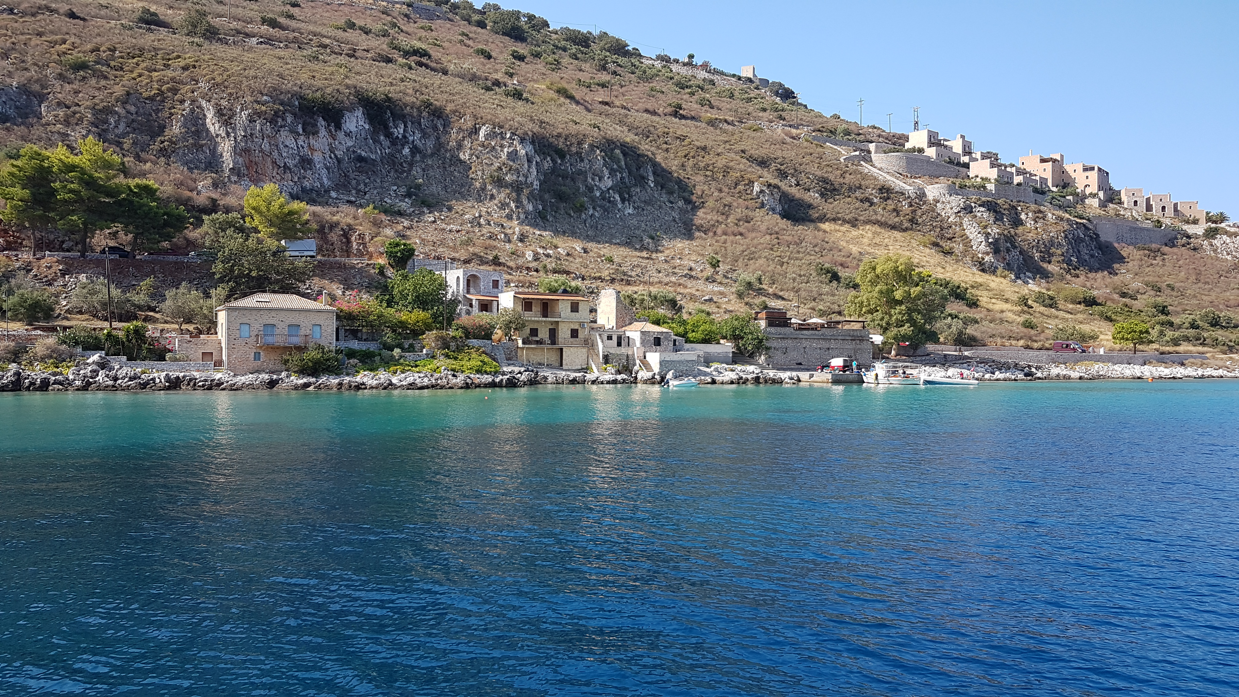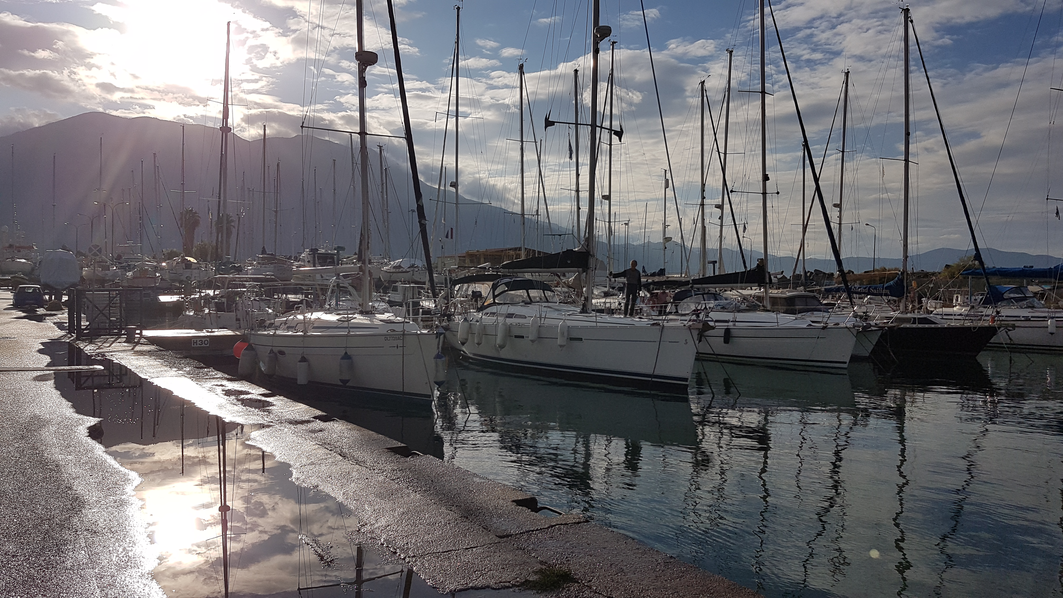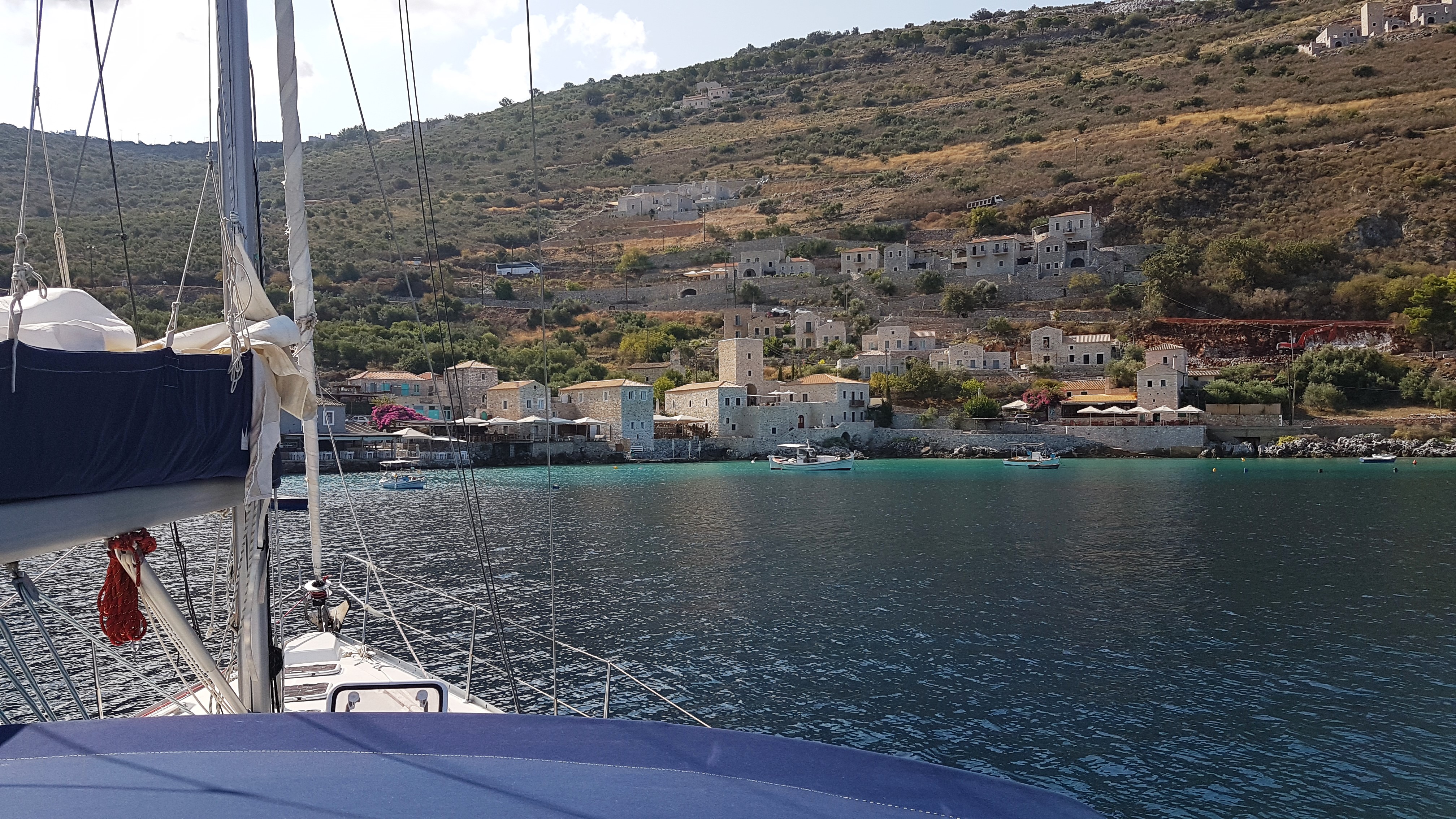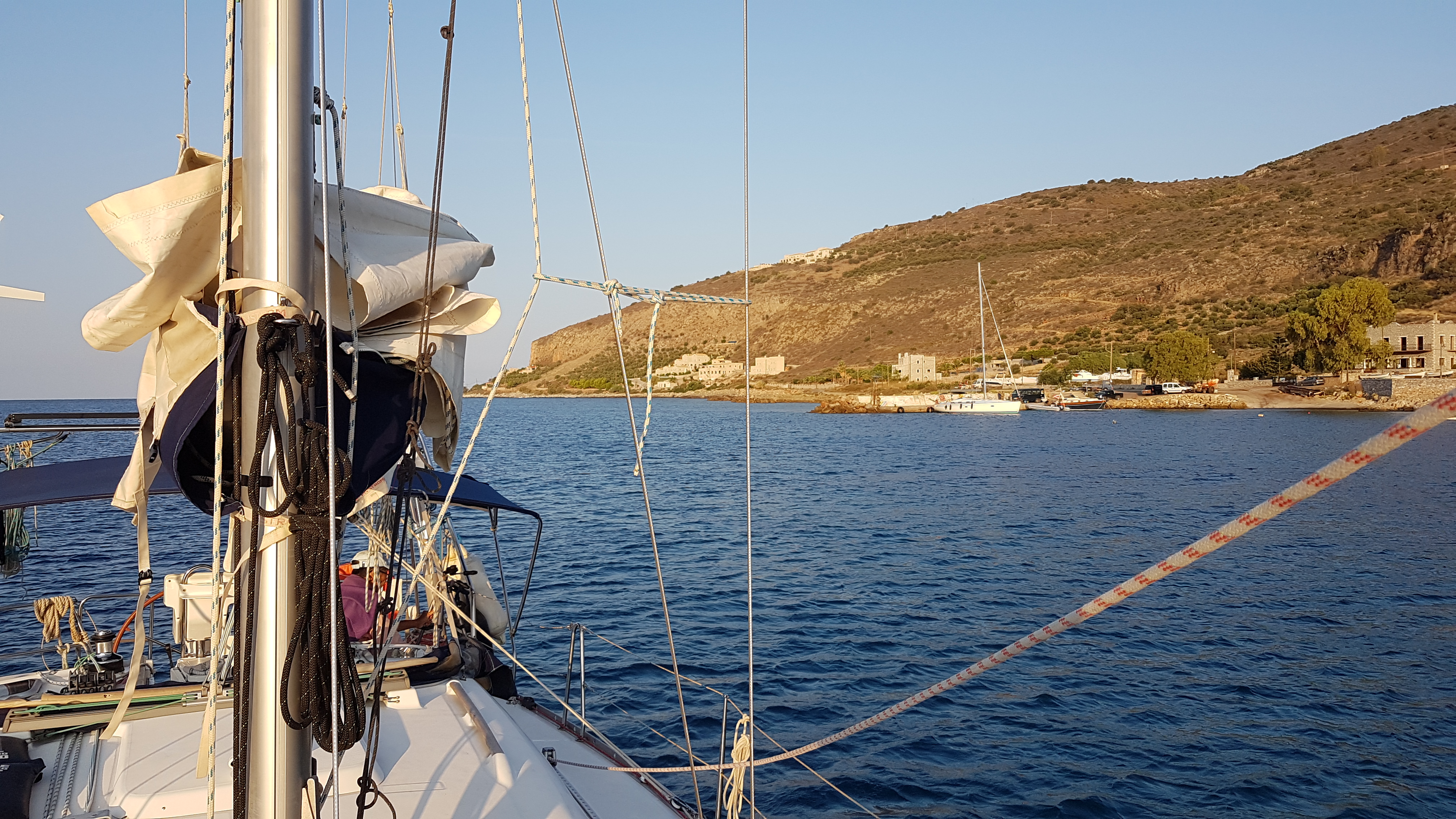 (On vient de se prendre une grosse rafale... A MONEMVASSIA, on est cul à quai, sur ancre, sur des plaques de pierres qui, dixit les voisins, ne tiennent pas !!! Heureusement qu'on est orienté Nord Sud et que le vent vient du Sud...)