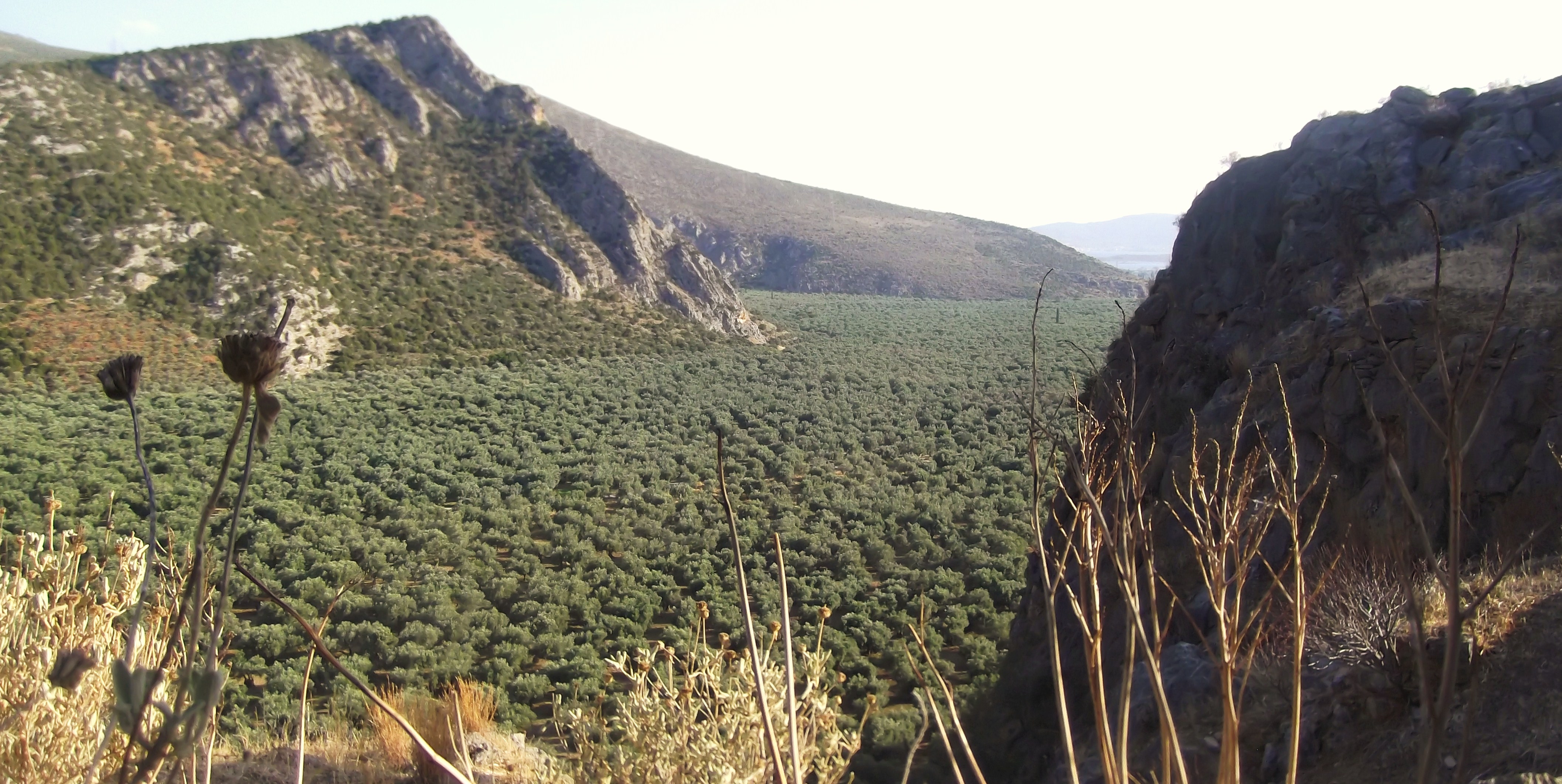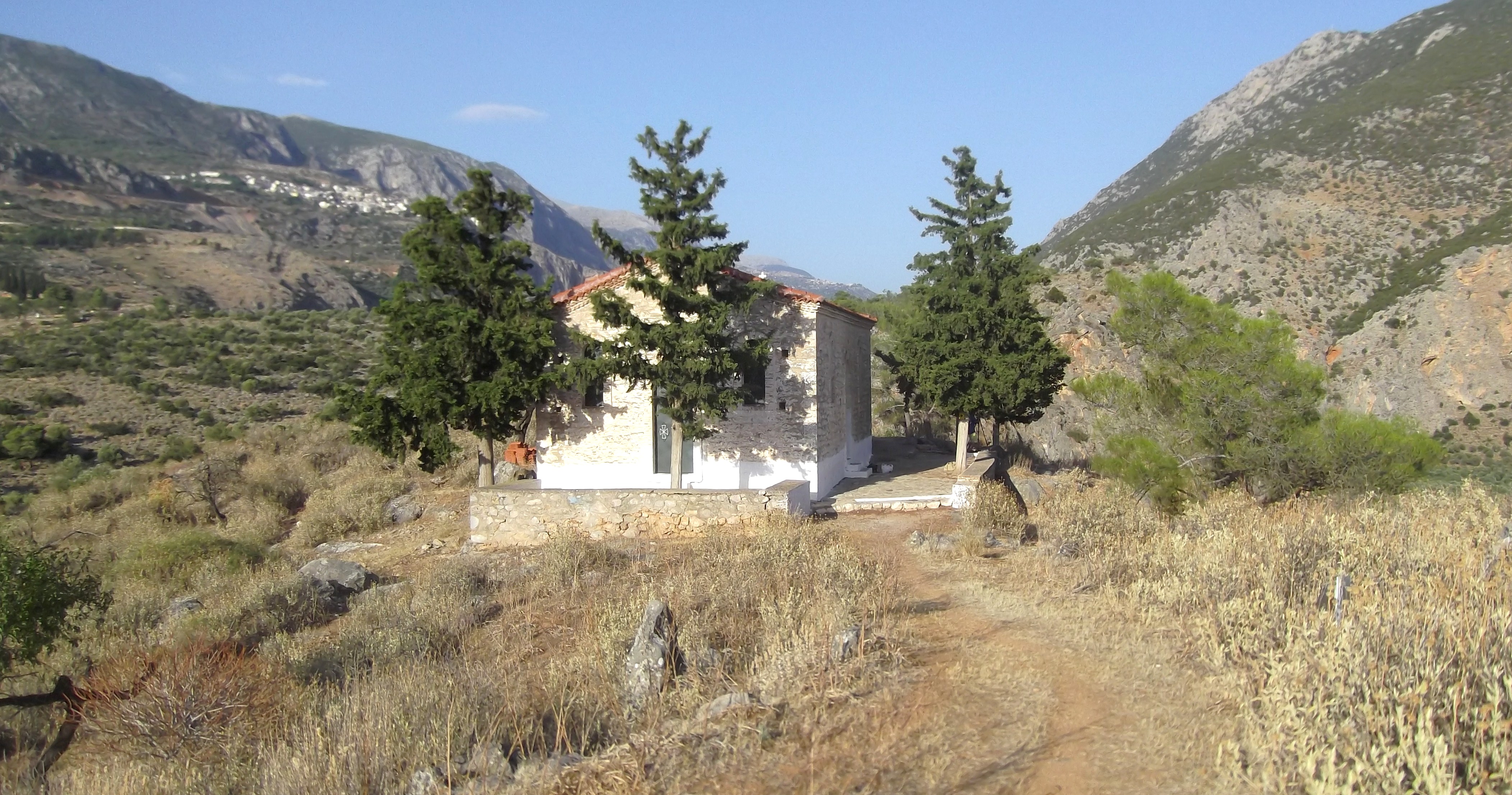 Le chemin débute au village tout en haut : DELPHES. Il traverse le second village avant de se perdre dans la mer d'oliviers.