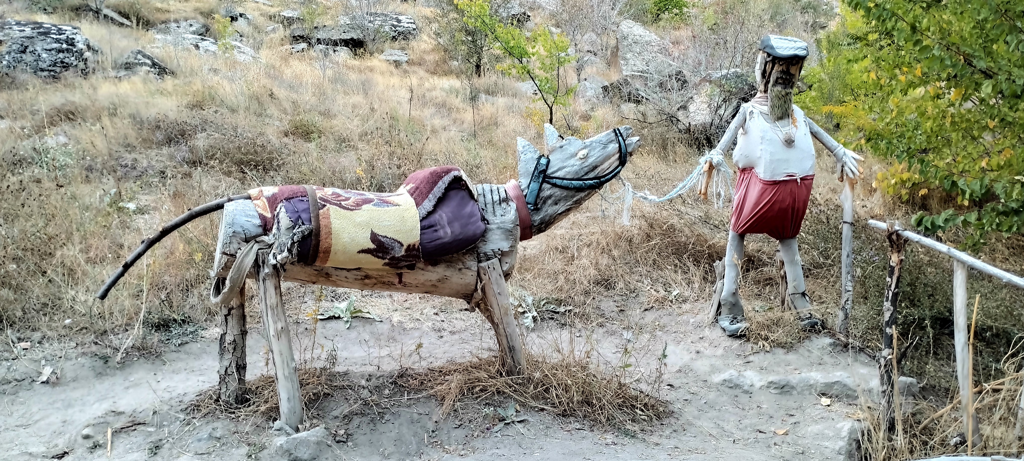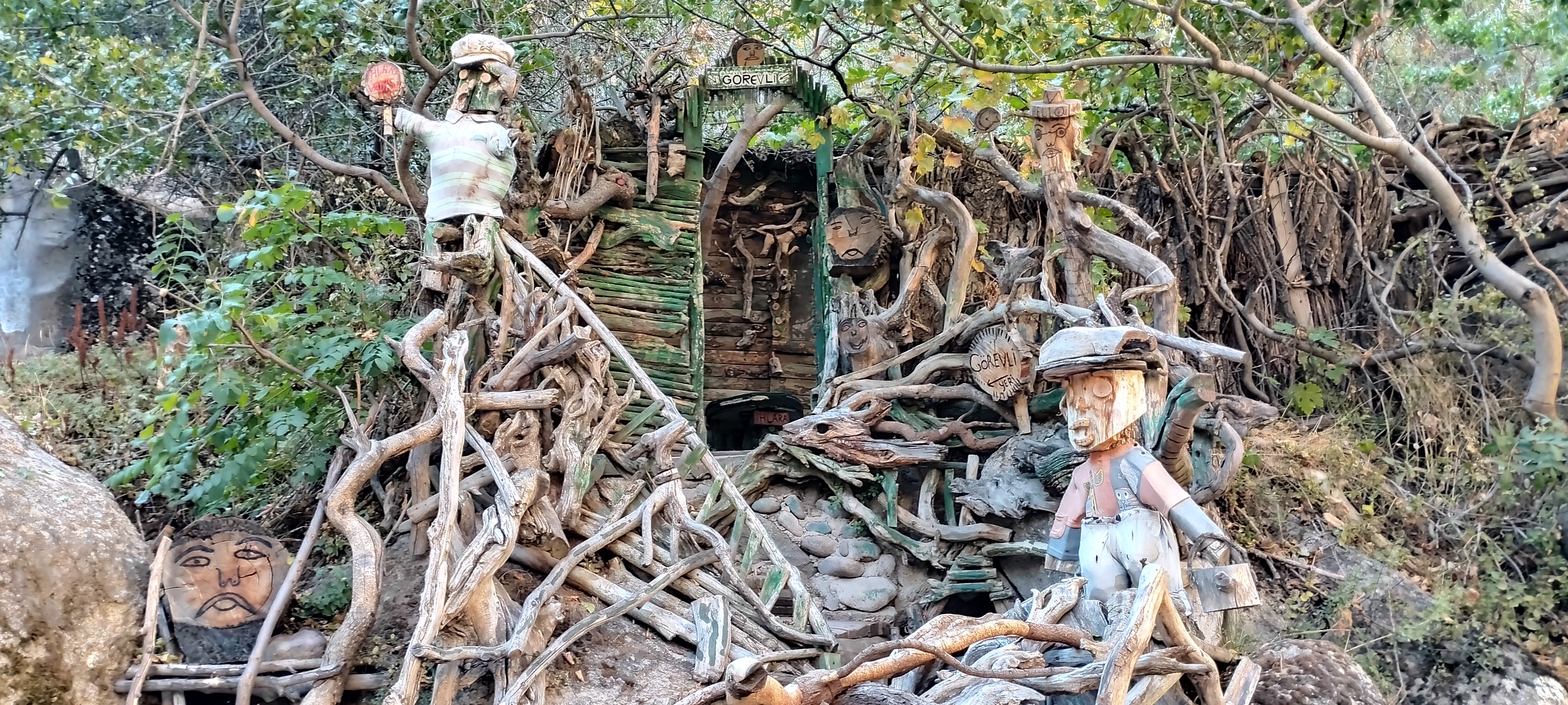 Pour cette photo, ce n'est pas le mousse qui parle ! Évidemment ! ... Pourtant, c'est un peu comme une église, une chapelle quoi. Fait de bois flotté, apporté par la rivière, et assemblé en artiste par un mec du coin ! Un entrelacs de branches où, en y regardant bien, outre les personnages qui sont faciles à voir, c'est tout un tas d'animaux fantastiques qui se cachent au milieu de tout ce fatras !