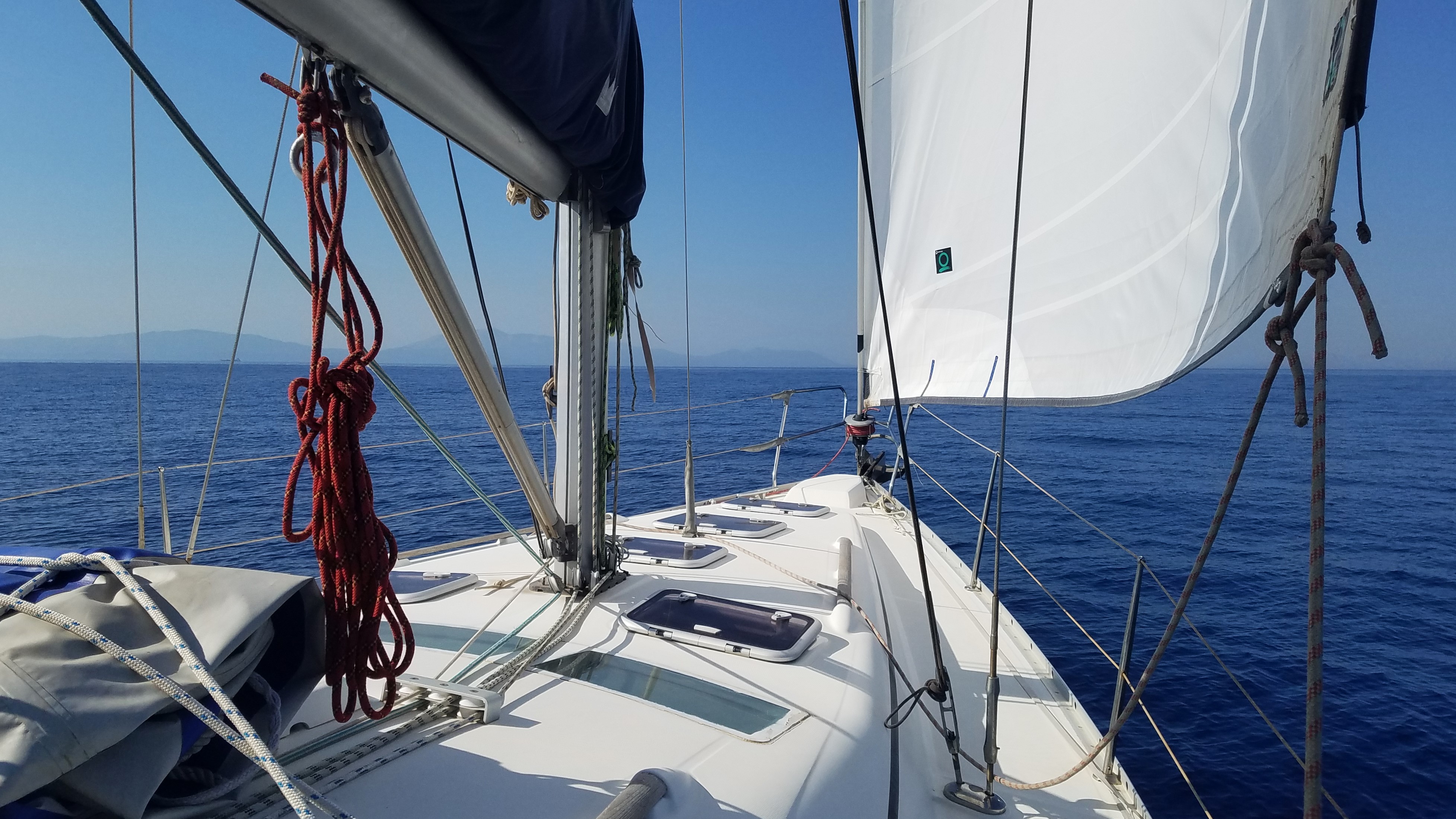Une belle journée de mer avec un p'tit vent sorti de nulle part, alors qu'au même moment, dans les CYCLADES toutes proches, le vent hurle dans les mâts !!!
