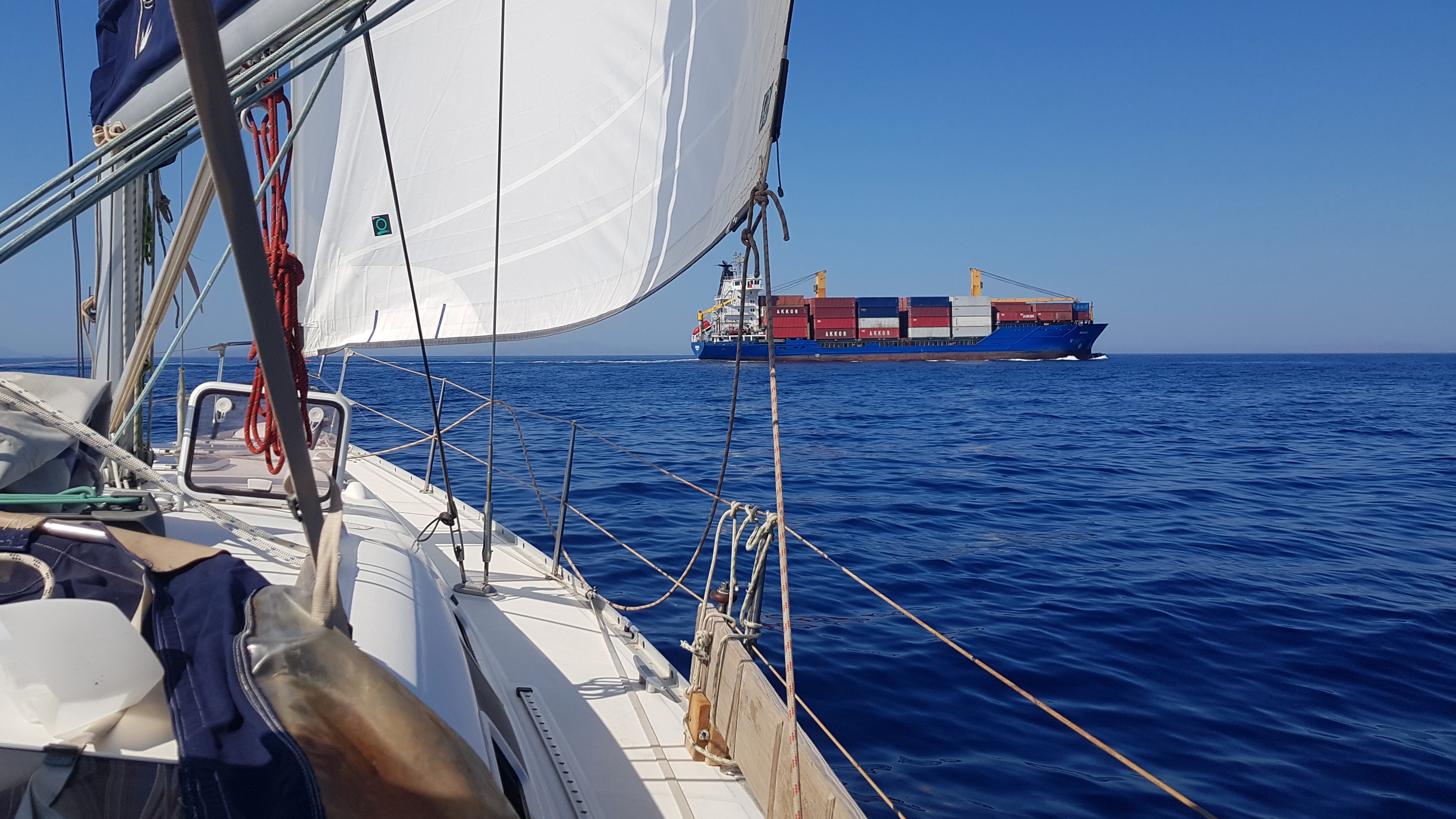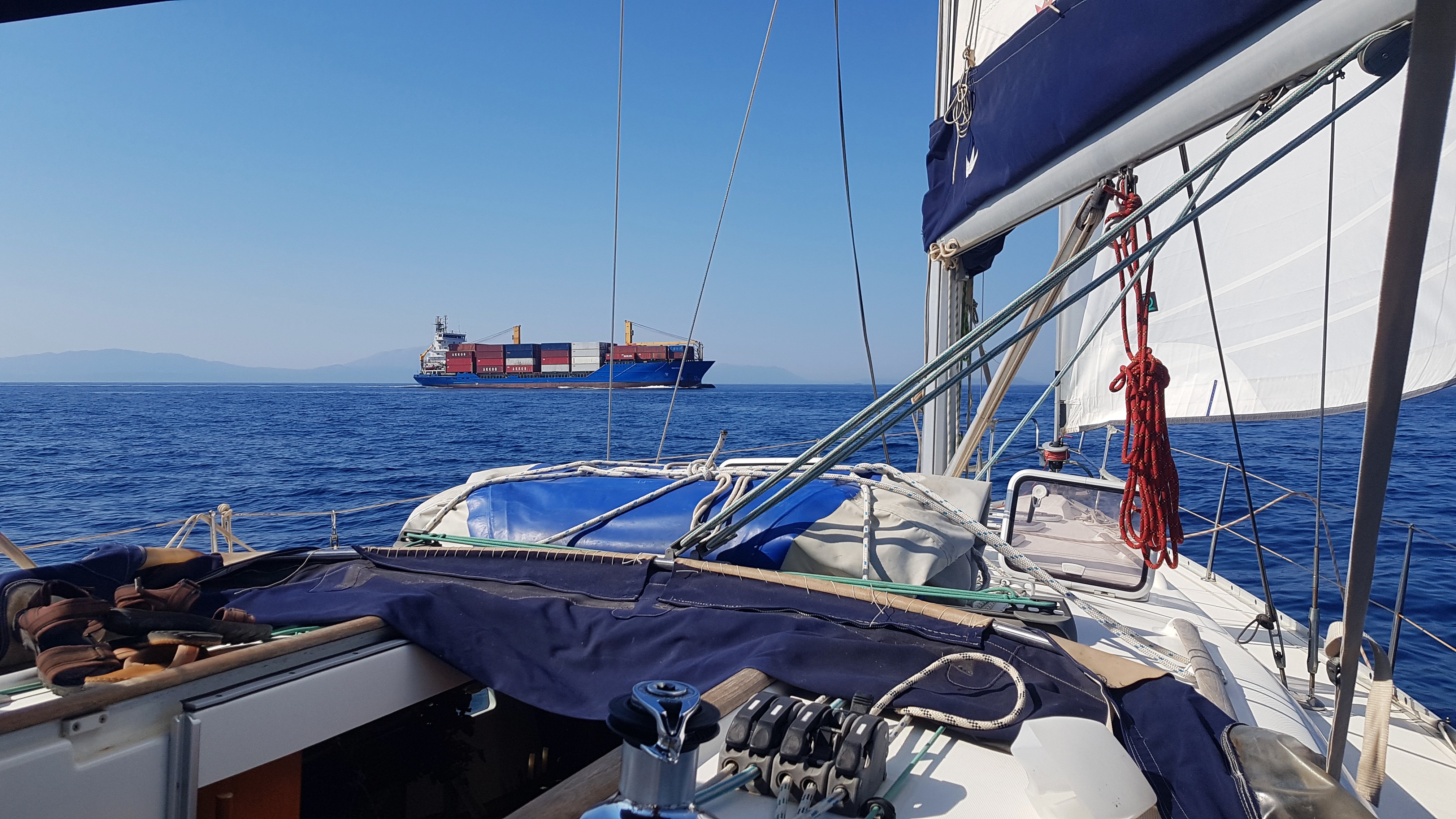 J'ai dû laisser le génois faseyer un moment pour bien lui montrer que je l'avais vu et que je n'avais pas l'intention de pénétrer dans le rail des cargos entre RHODES et le Nord de l'EGEE en revendiquant ma priorité en tant que voilier avançant à la voile !