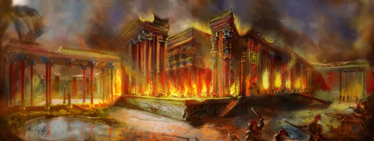 Persépolis, la capitale de l'empire perse, a été incendiée par le Macédonien en l'an 330 avant notre ère, c'est-à-dire cent cinquante ans après le sac de l'Acropole par Xerxès.