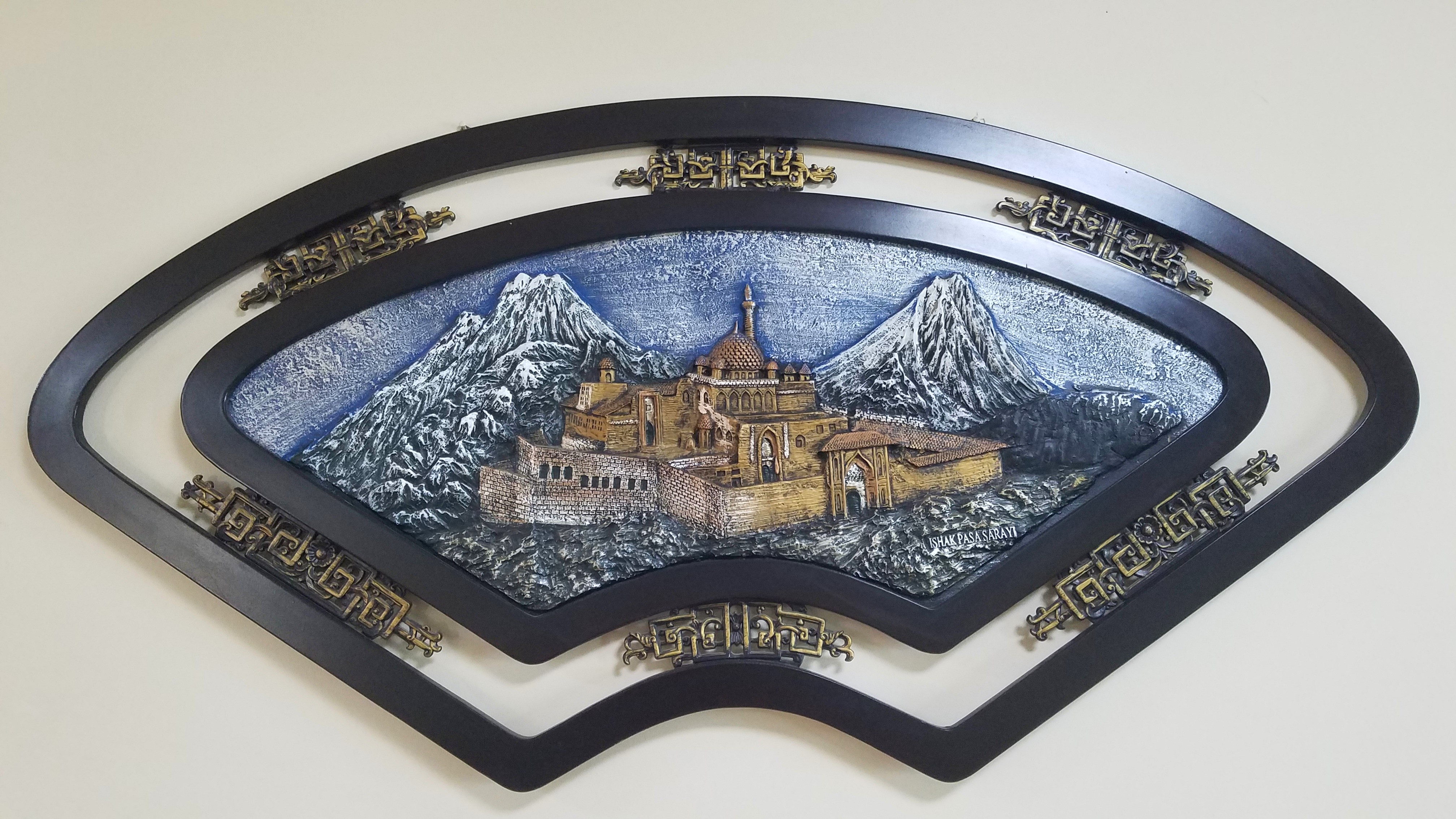 Ces motifs géométriques de l’Empire du Milieu participaient à l’encadrement d’un tableau où figuraient les deux « must » situés à la frontière : le mont Ararat et le palais اسحاق پاشا (translittération : Ishaq Pacha) :