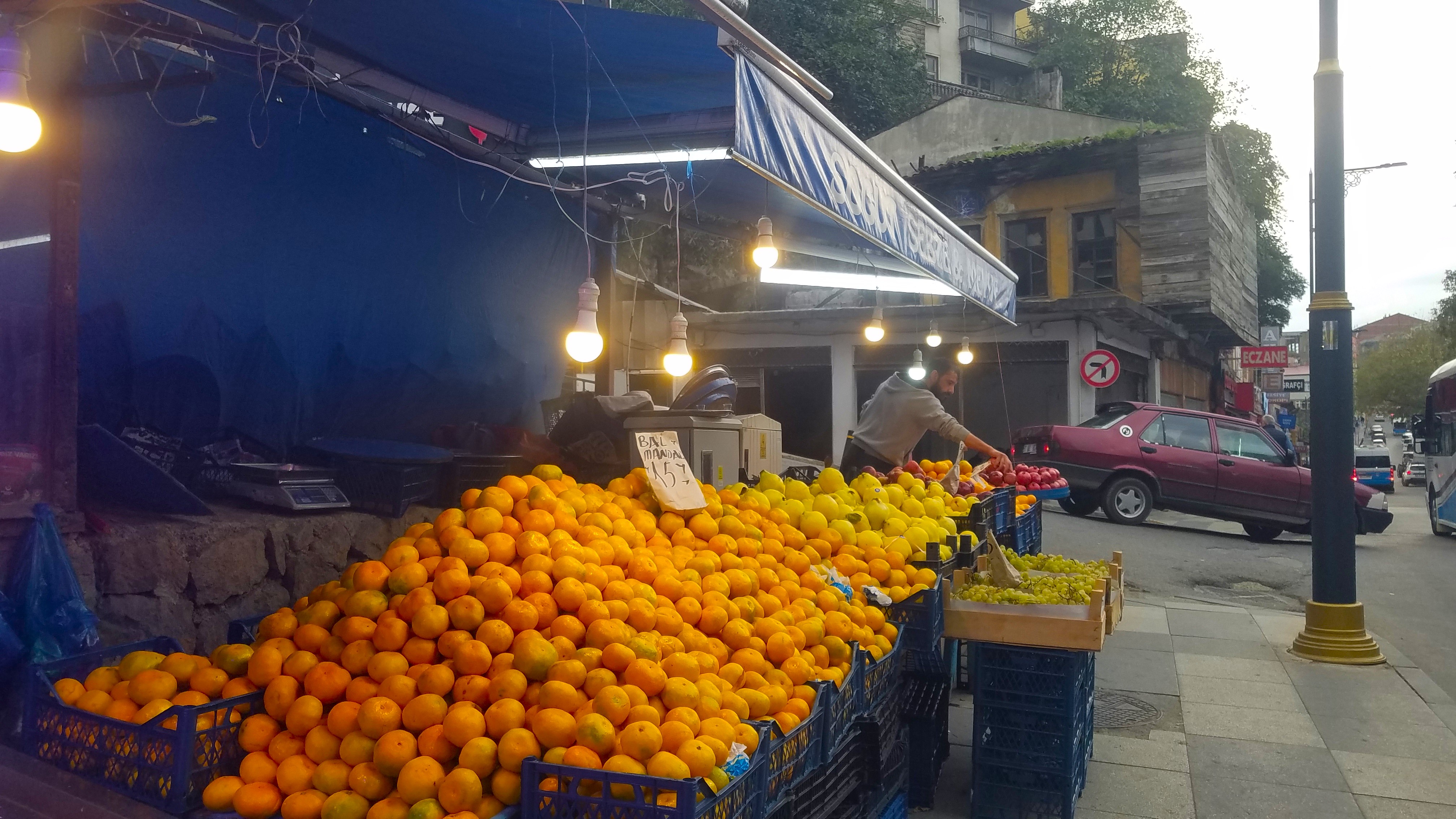 Nous sommes arrivés à ce carrefour en longeant l’étal des agrumes, et vers celui des grenades, nous avons bifurqué à gauche pour emprunter la montée, avec la mer dans notre dos.