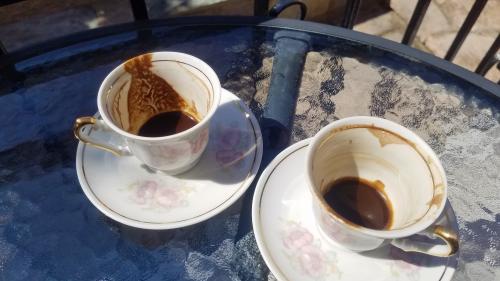 En guise de bienvenue, du café nous a été offert. Nous avons tenu à préciser que nous le voulions ελληνικό – ΕΛΛΗΝΙΚΟ (littéralement : « grec »), c'est-à-dire à l'orientale, et non à l'occidentale. Notre requête a beaucoup plu à nos hôtes, qui ont compris que c'était au pays de l'âme que nous voulions voyager.