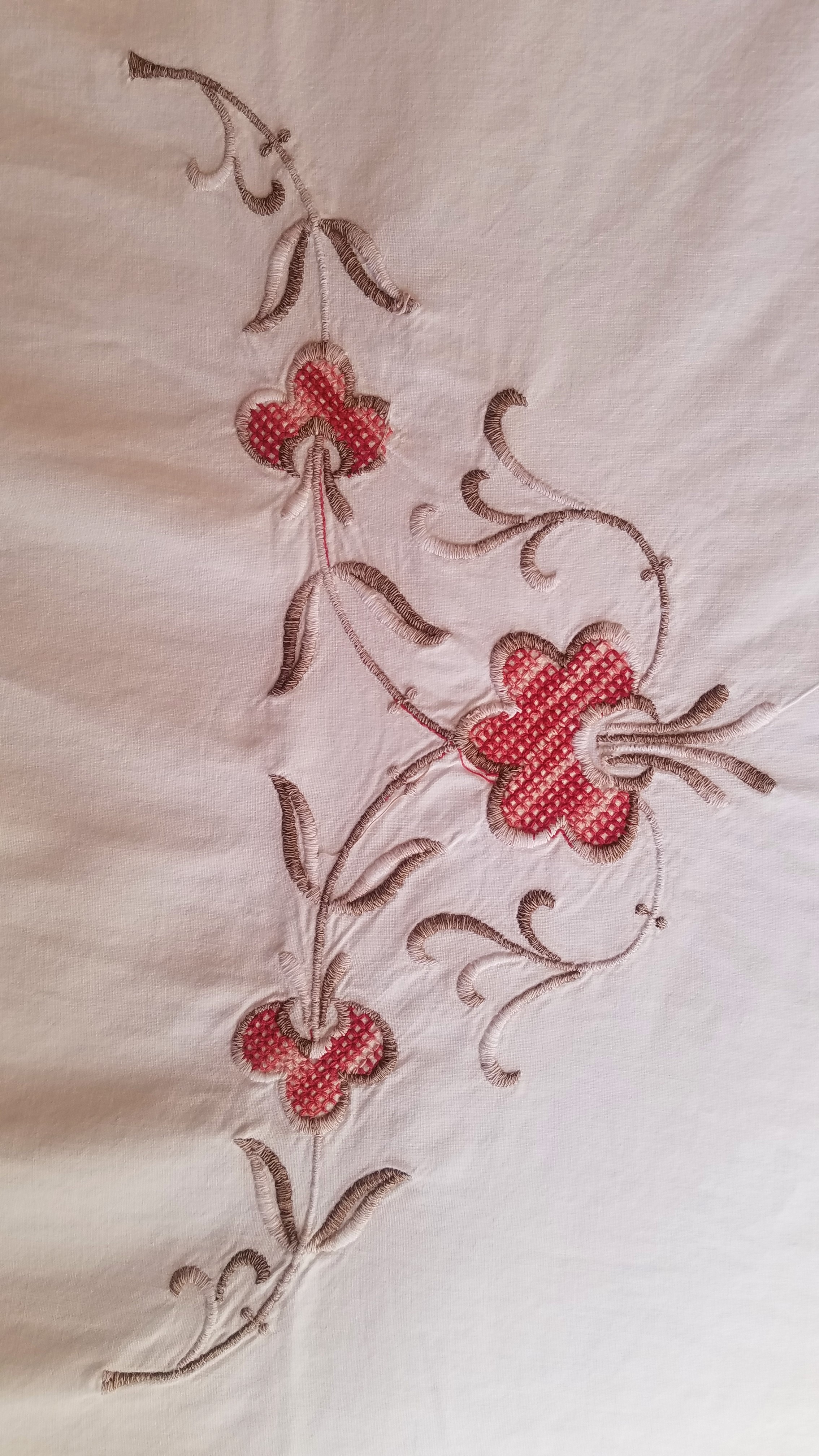 La muse des lieux a mis à notre disposition de la vaisselle fleurie, mais aussi des draps fleuris. Voici la broderie qui nous tenait compagnie pendant notre sommeil :