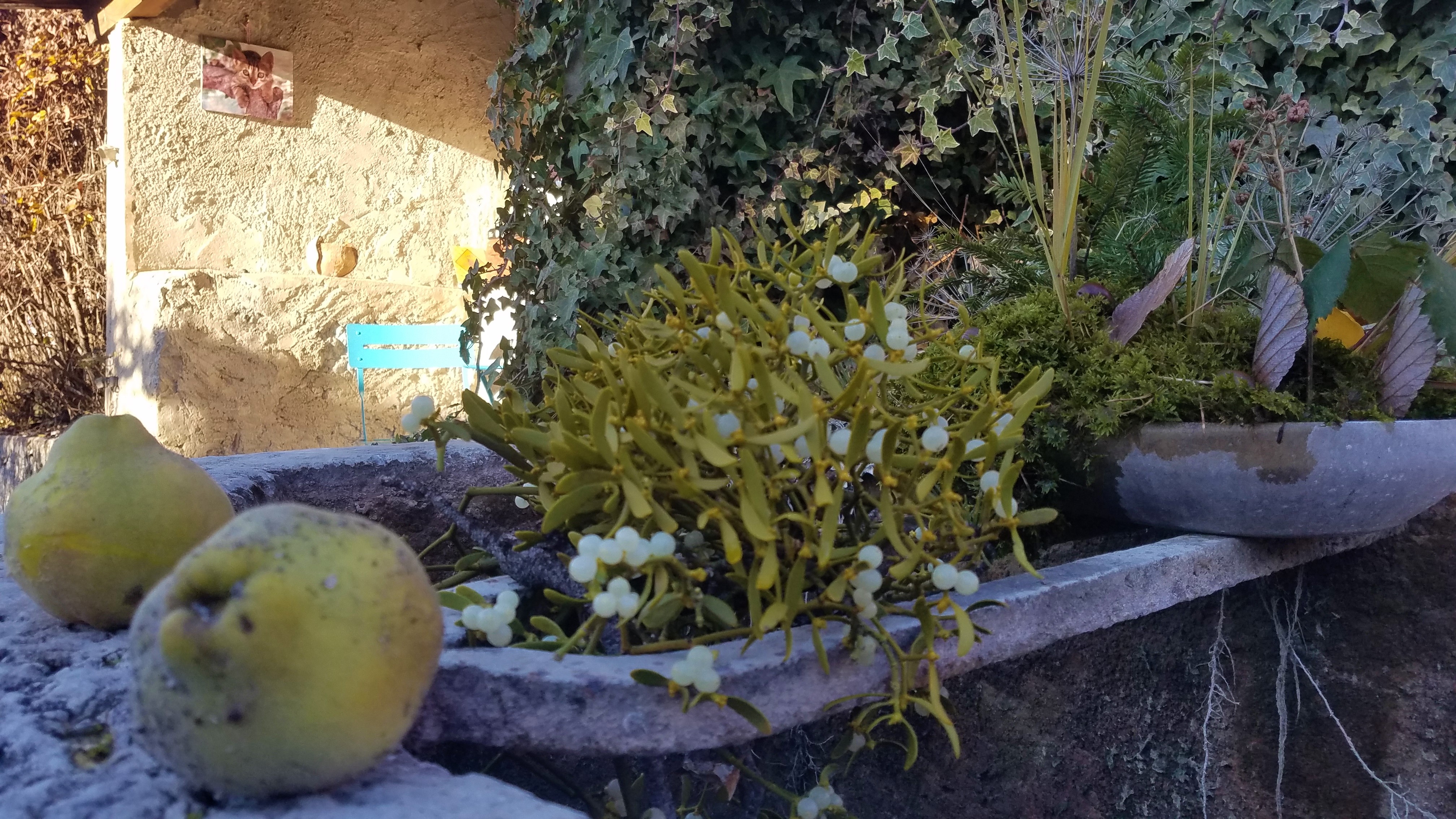 Sur le rebord supérieur de la fontaine, la robe jaune de deux coings émerge de la pénombre. Depuis quelques jours, un bouquet vient leur tenir compagnie. Il s’agit d’un bouquet de gui, cueilli au cours d’une promenade sur les hauteurs situées au Sud-Ouest du QG du Hanabi.