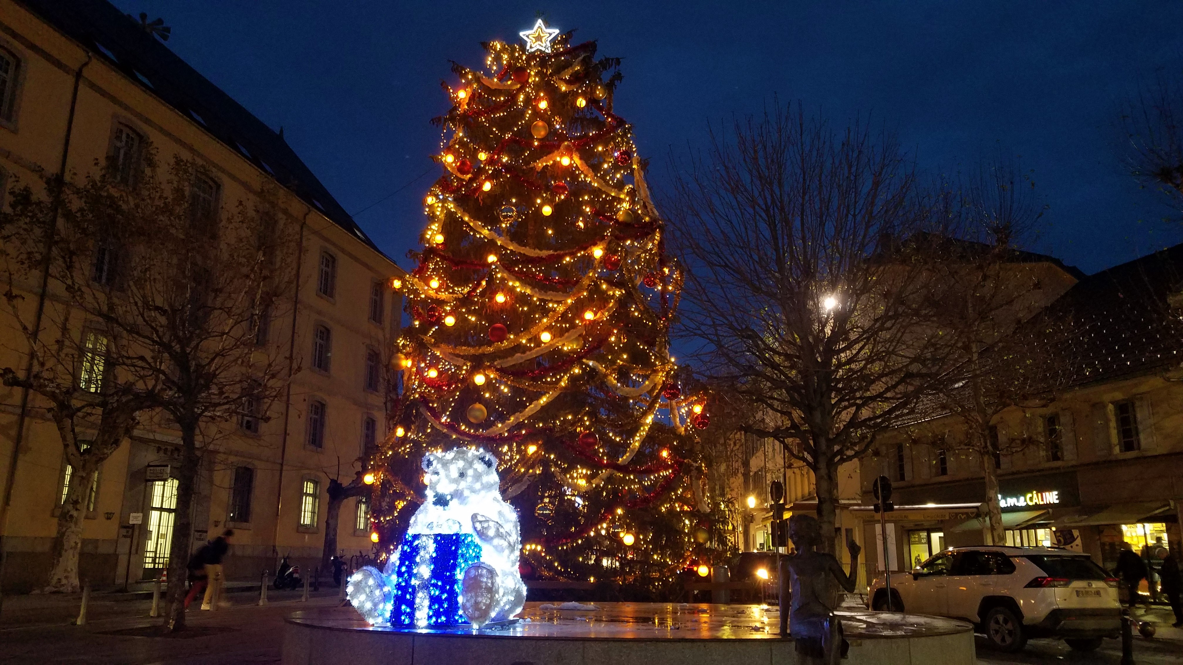 En effet, à peine quelques pas plus loin, dans la rue de France qui passait devant le bâtiment de la mairie, le mousse a aperçu à l’autre bout un immense sapin illuminé et un ours lumineux, assis devant.