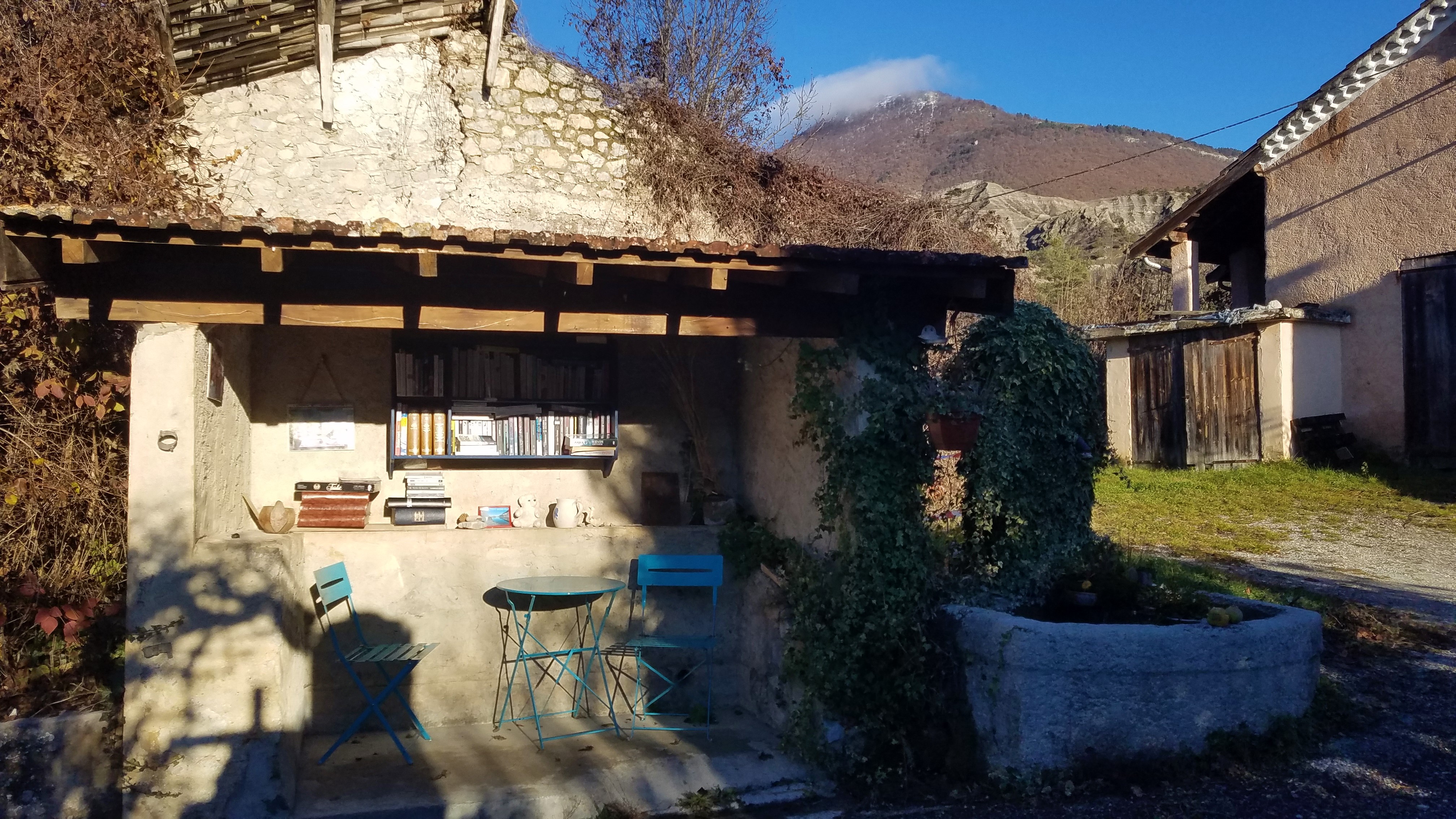 Sur la droite de la photo, une fontaine jouxte la bibliothèque. Cet aménagement offre au visiteur une double satisfaction : celle d’étancher la soif d’eau en même temps que la soif de culture. Ainsi, l’hospitalité se vit à la fois au premier degré et au deuxième degré.