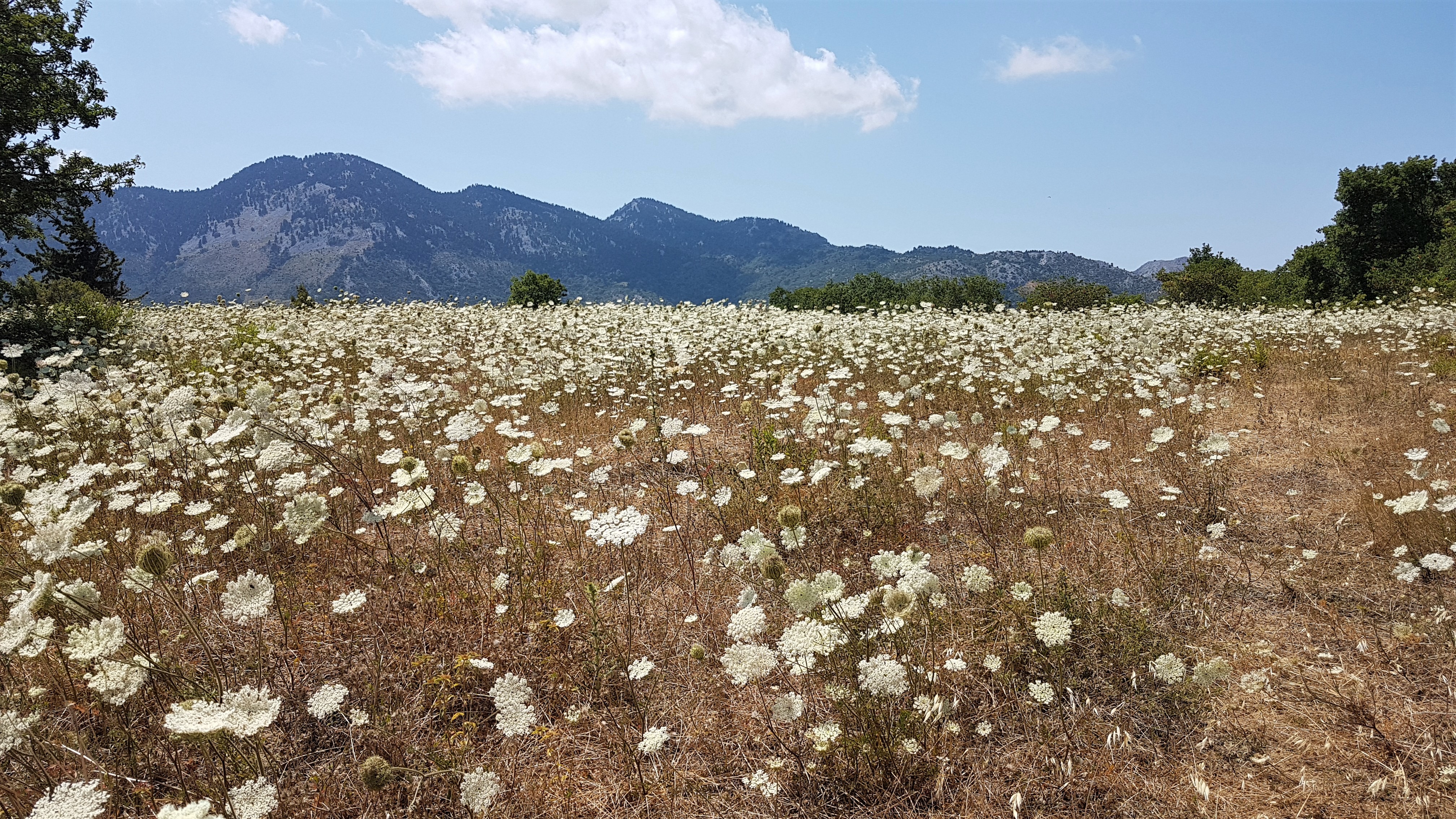 Un champ fleuri. Je sais bien que vous voyez bien que c'est un champ fleuri... Mais faut quand même que je le dise pour être certain que vous ne voyez pas autre chose ! Bien sûr, vous pouvez voir les montagnes derrière, mais moi, quand je me suis arrêté ici, en plein virage, c'est un champ fleuri que j'ai vu !