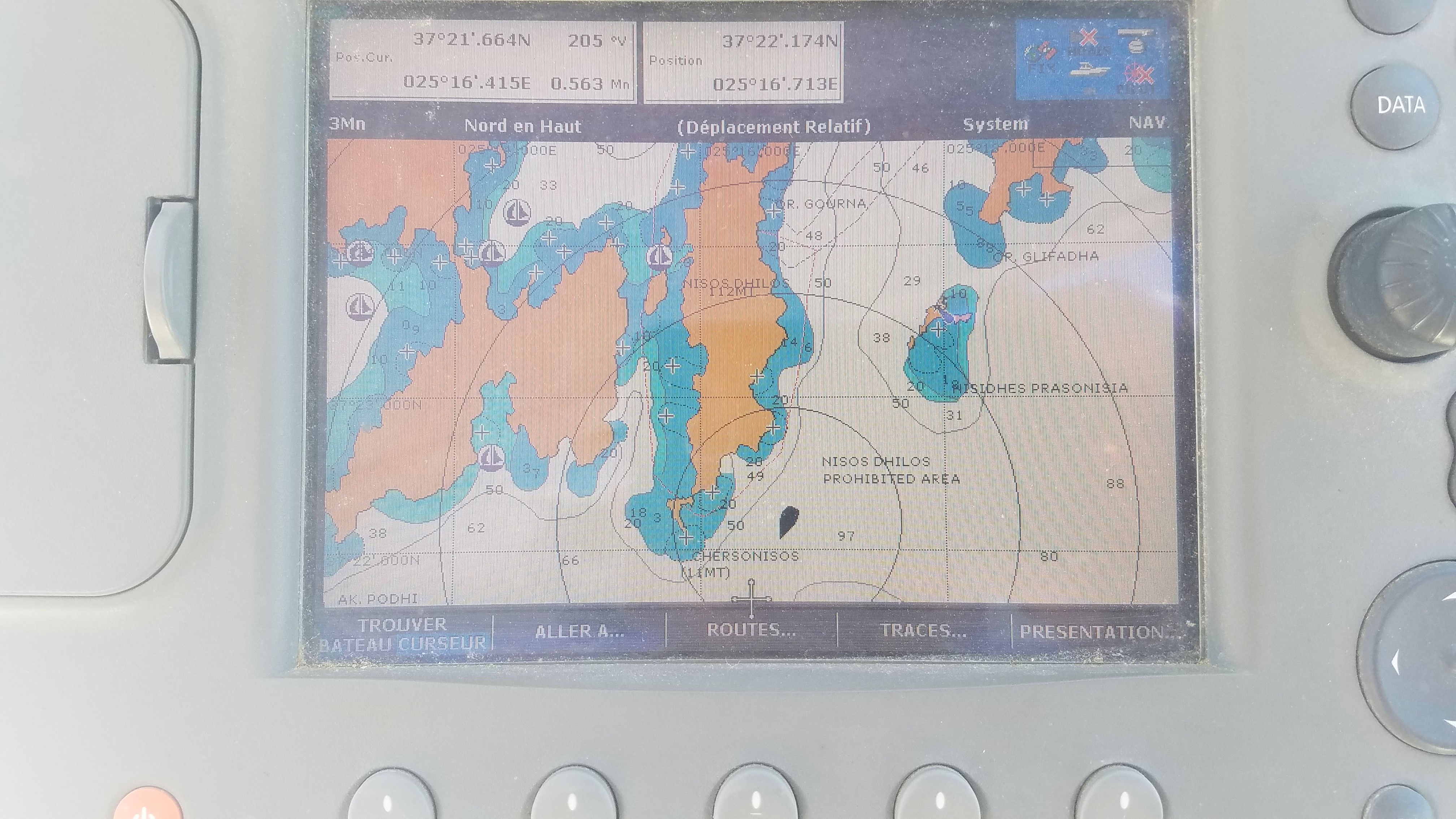 L’indication « NISOS DHILOS », qui était la transcription en caractères latins de l’expression grecque « Nησί Δήλος » (en français : île de Délos) figurait sur la carte marine en deux endroits. D’abord, à l’arrière du profil du bateau. Ensuite, sur le corps orangé de l’île à tribord du Zeph.