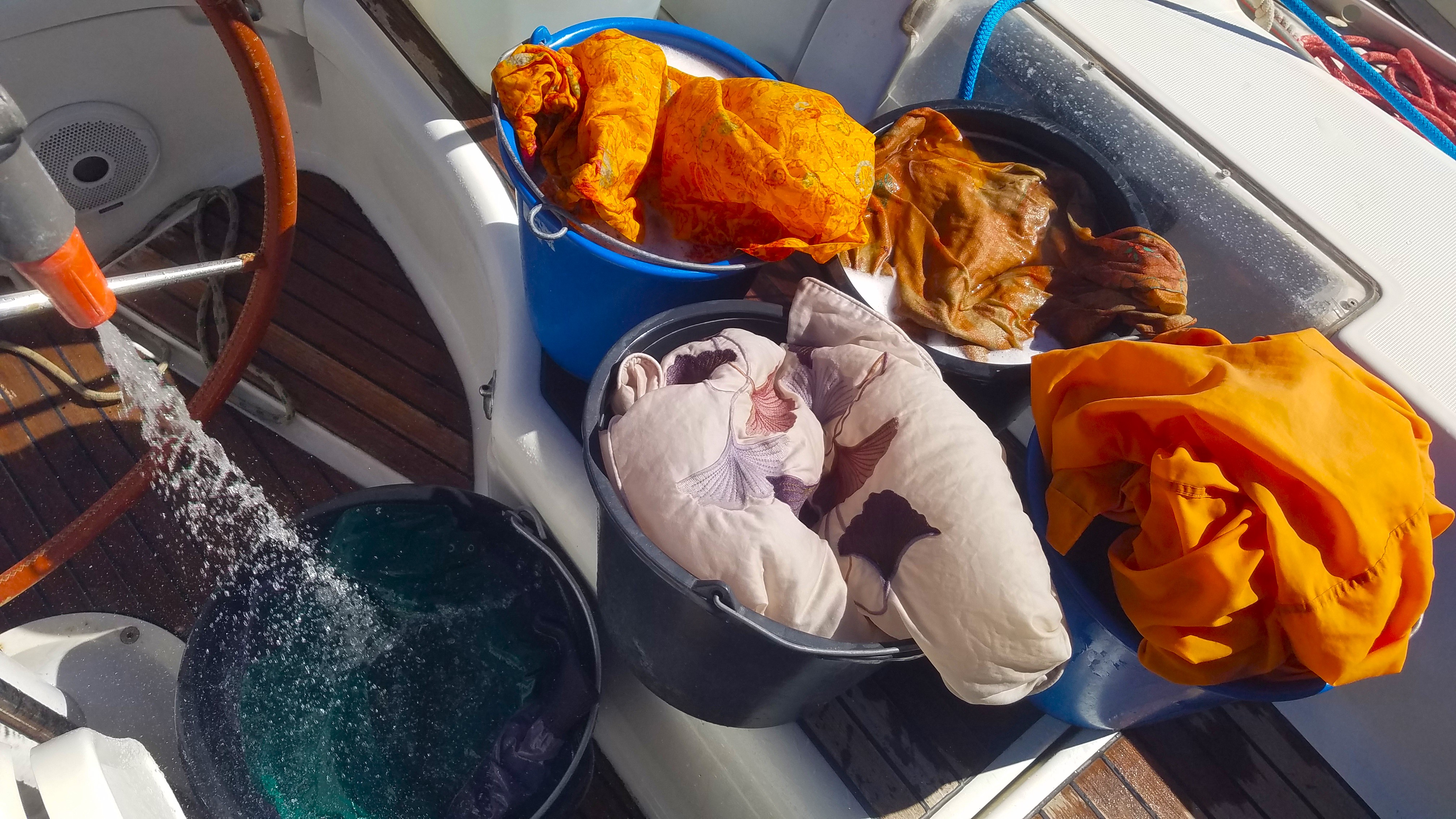 Avant de larguer les amarres, nous avons utilisé jusqu’à la dernière goutte l’eau que nous avions achetée à la borne des énergies. Le mousse a lavé les habits.