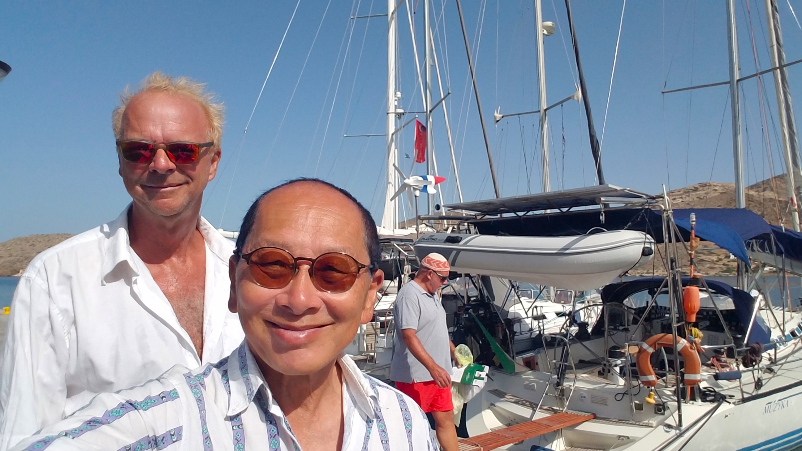 Le selfie a été réalisé devant le Zeph, dont l’éolienne tricolore était facilement reconnaissable. Derrière nous, passait le Florentin qui nous avait pris les amarres la veille et dont le sens de l’à-propos s’exprimait avec tant de clarté et d’élégance dans la langue de Molière.