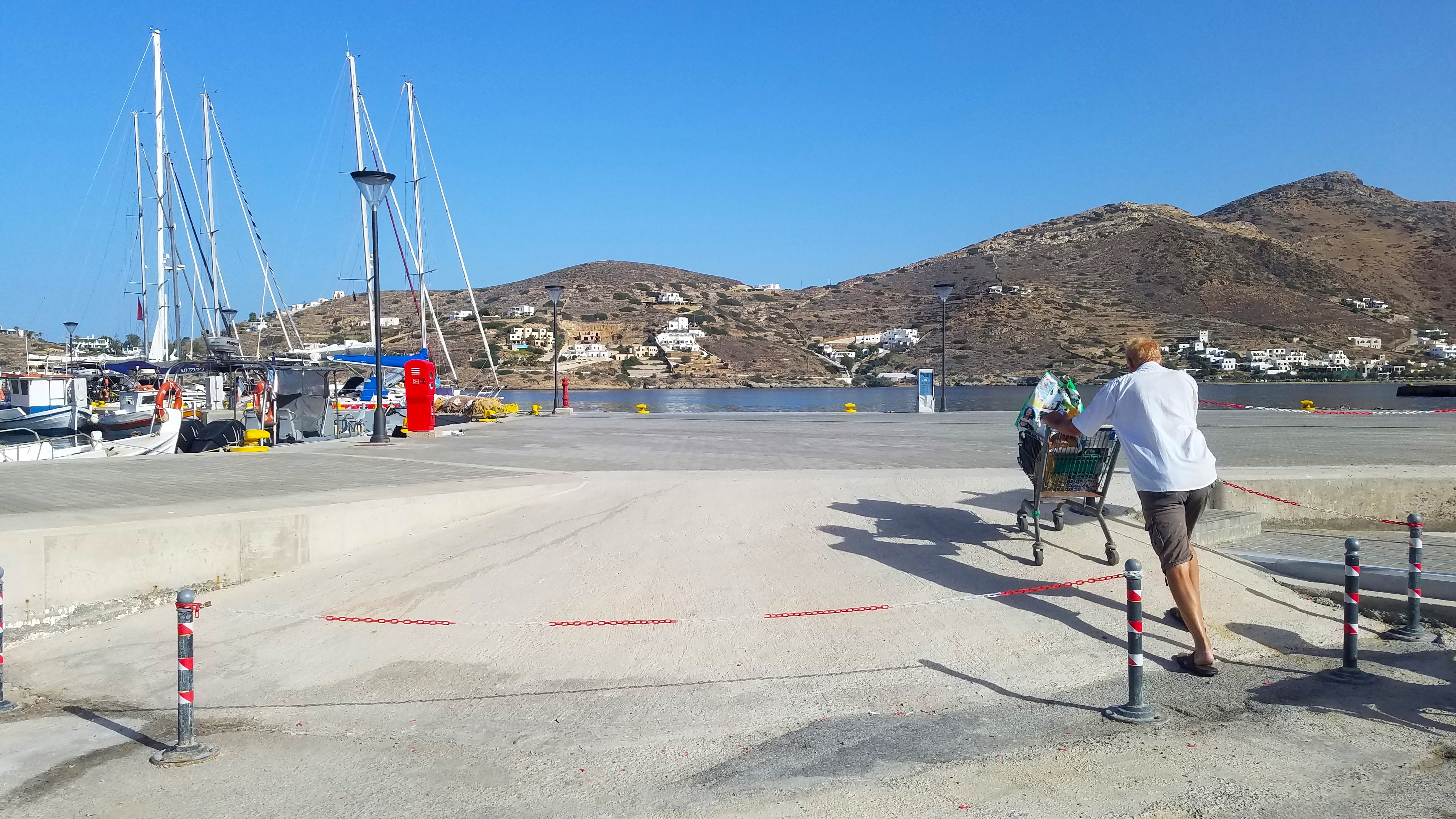 Toutes voiles dehors, le Zeph s’est dirigé vers la baie de Κατάπολα (transcription : Katapola), qui accueillait les ferries.