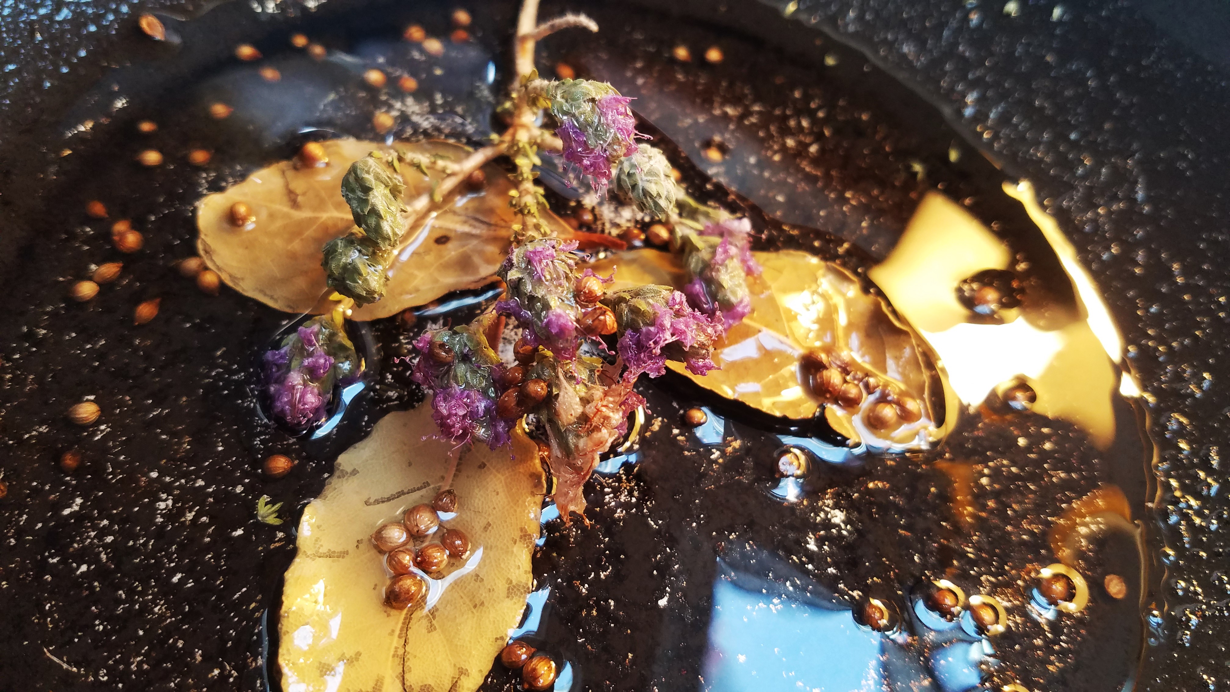 Les préliminaires étaient olfactifs. La coriandre en graines, le thym fleuri et le laurier étaient torréfiés pour préparer la cuisson du poulet au wok :