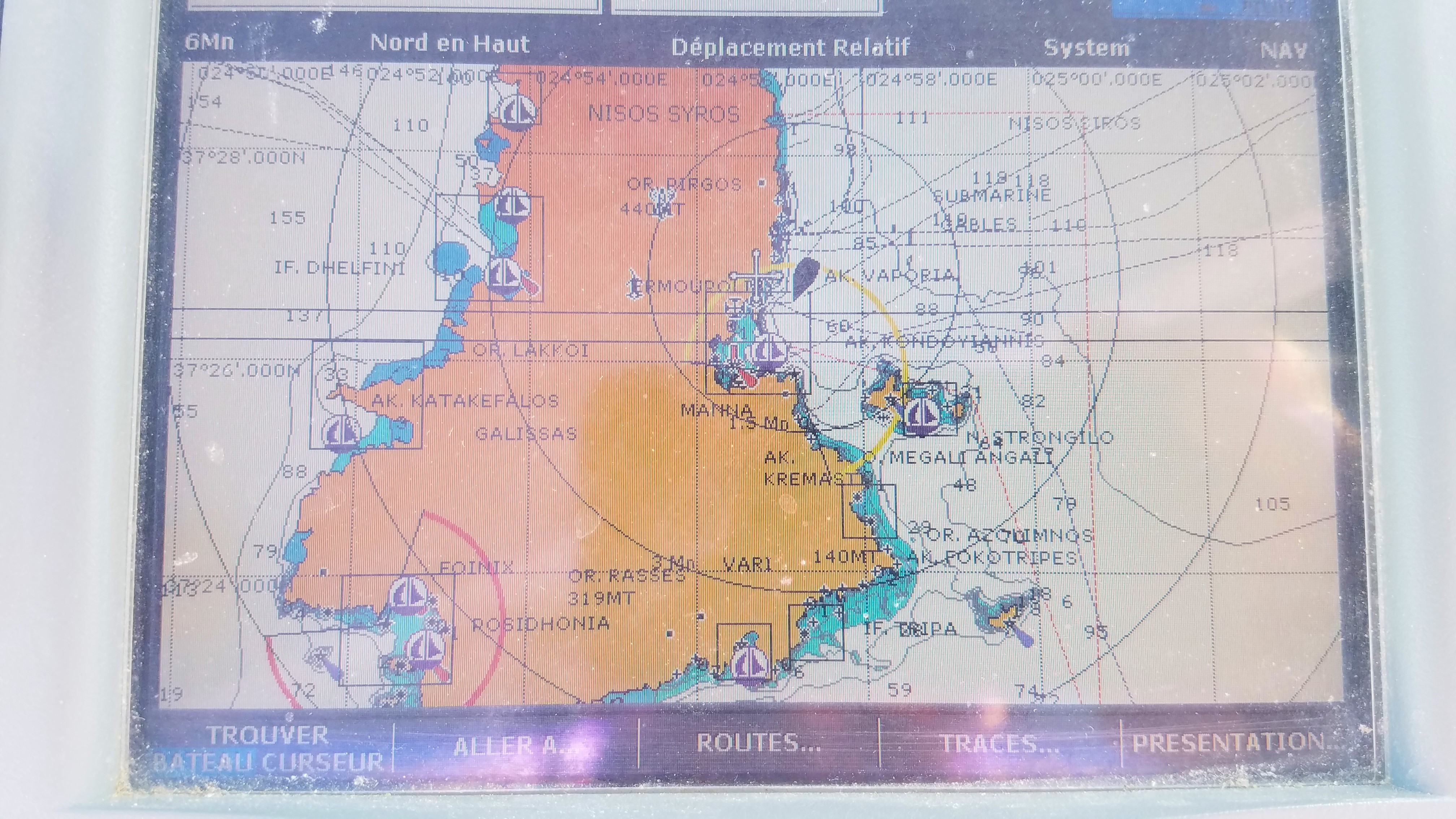 En sortant du port de Κέα, le voilier des Milanais a tourné à gauche, c’est-à-dire vers l’Ouest, en direction de Πόρος (transcription : Poros) tandis que le Zeph a tourné à droite, c’est-à-dire vers l’Est, pour rejoindre Ερμούπολη (transcription Ermoupoli), sur l’île de Σύρος (transcription : Syros).