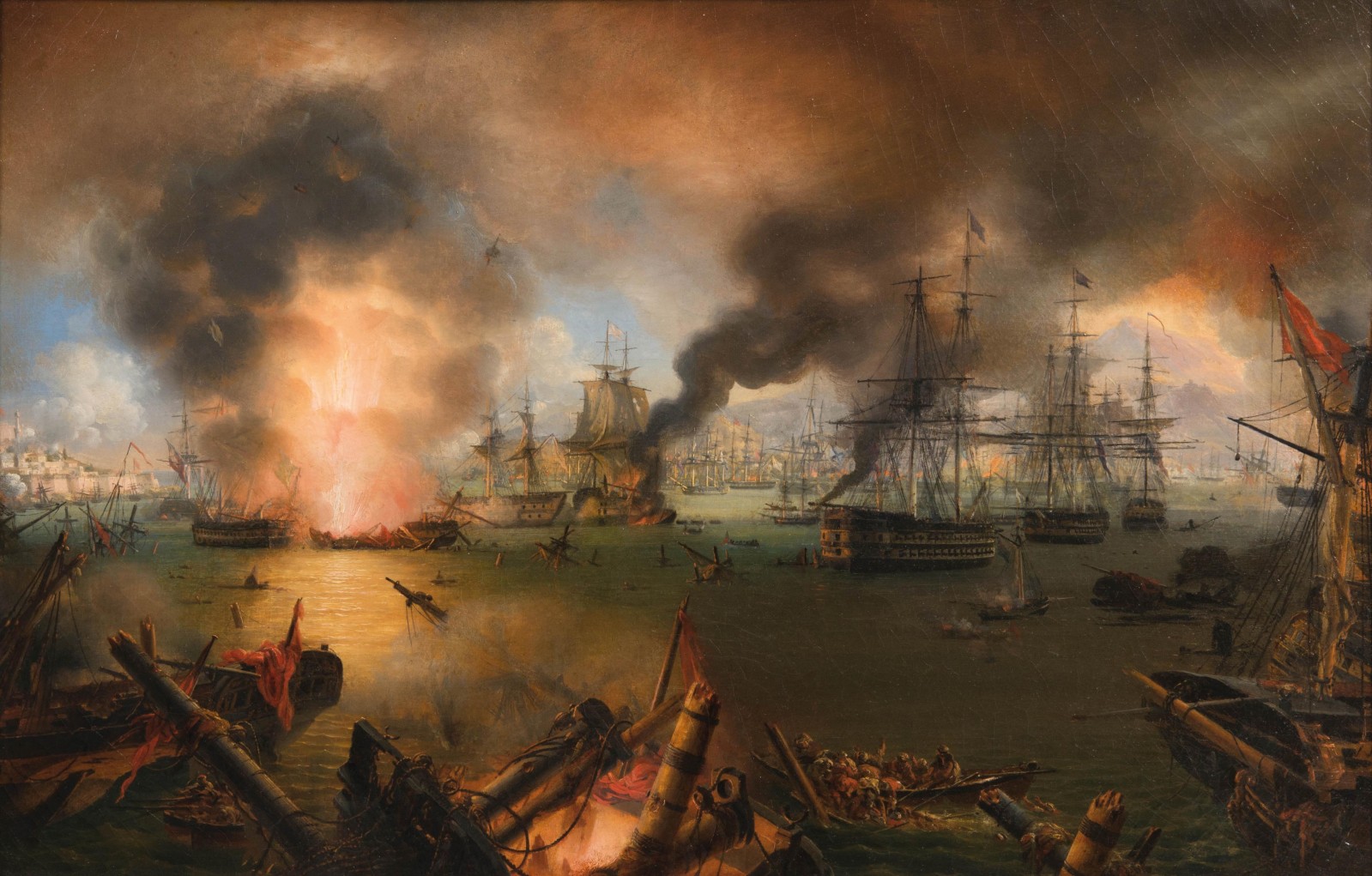 L'ottoman avec ses drapeaux rouges est représenté au premier plan. Malgré que ses navires soient trois plus nombreux que ceux de l'alliance philhellène, il a essuyé une cuisante défaite avec une soixantaine de vaisseaux détruits, soit les deux tiers de sa flotte.