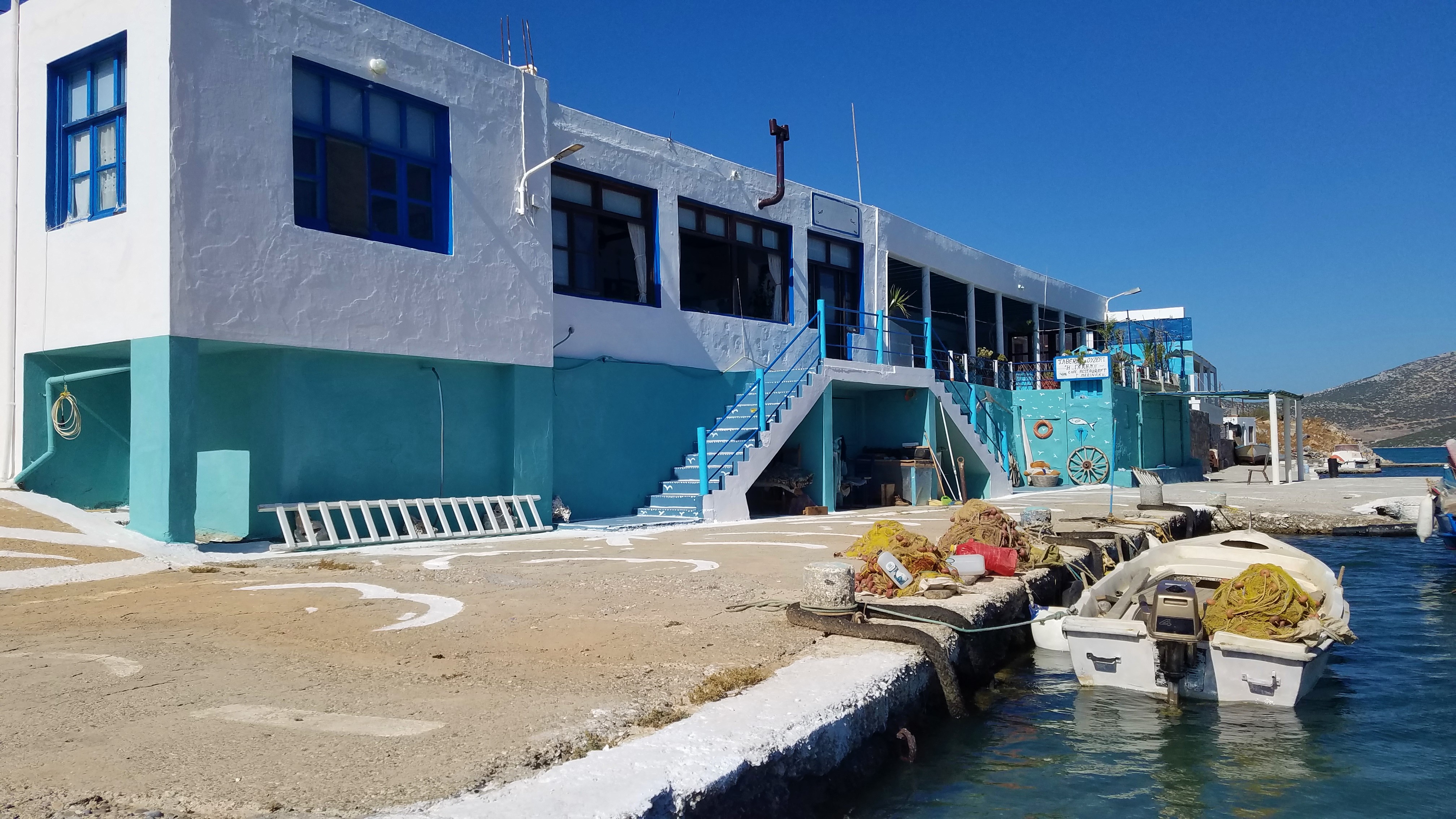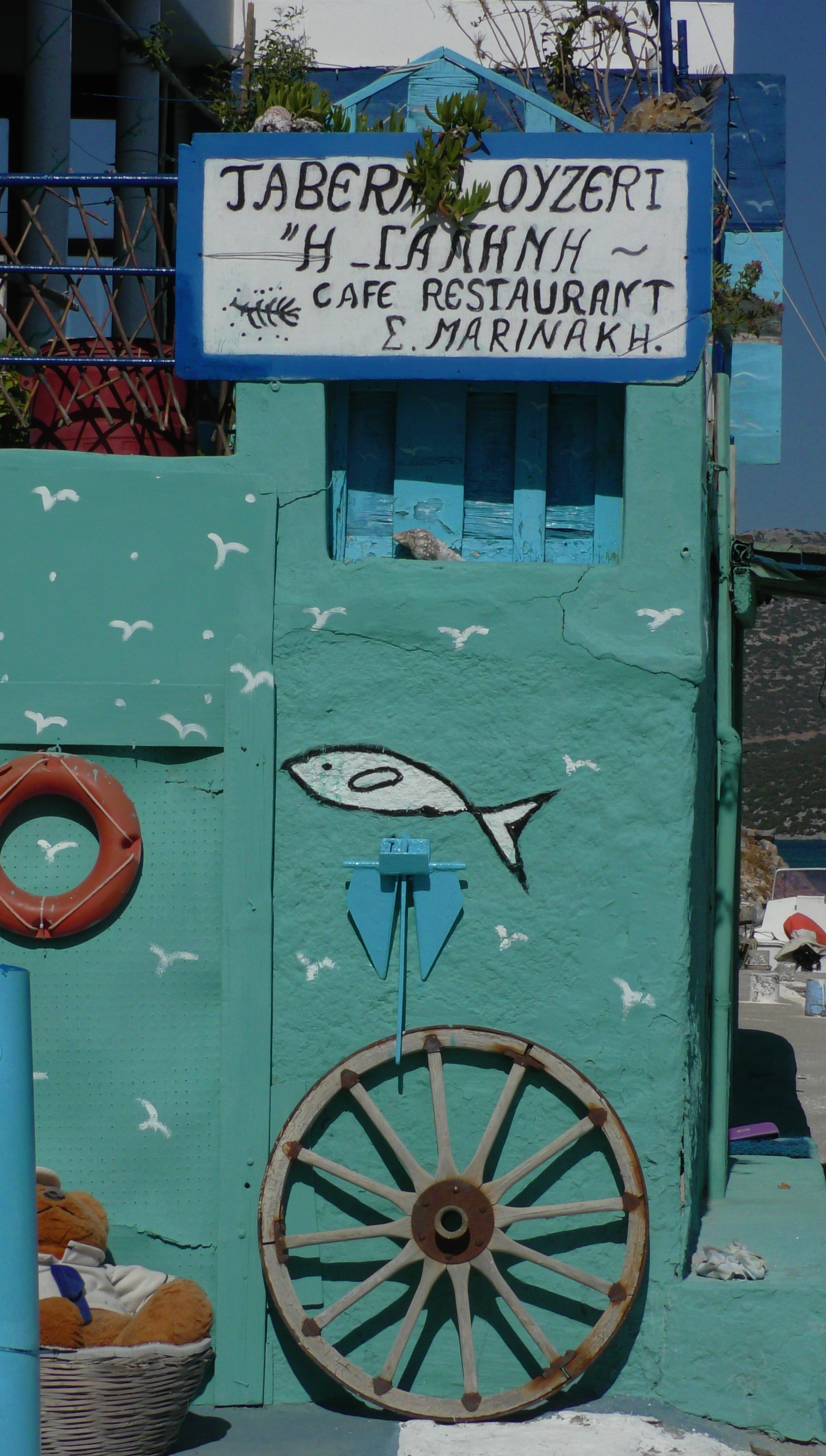 La première ligne indiquait s'agissait d'une « taverne » et d'un « bar à ouzo ». On pourrait donc y manger et boire, ou seulement se rafraîchir avec un verre d'ouzo.