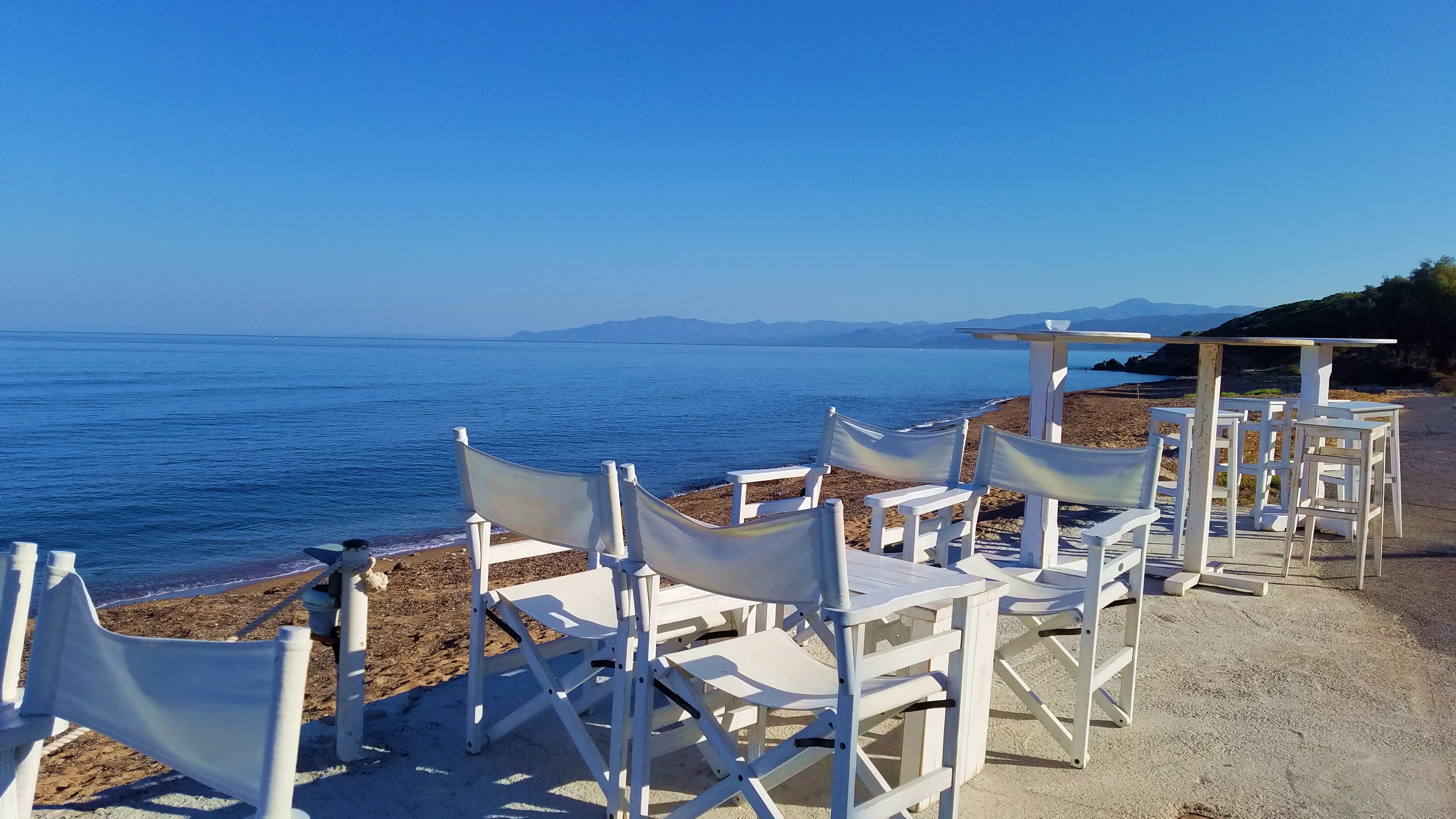 Des sièges étaient encore placés en hauteur, pour bénéficier d’une vue plongeante sur la mer. Mais contrairement à la terrasse précédente, qui était structurée par des segments de droite, ce balcon à Ιθάκη – ΙΘΑΚΗ faisait la part belle à la ligne courbe. Le double rebord de la table et l’armature des chaises rendaient hommage à l’élégance de l’espace incurvé. Le tracé rectiligne est une invention de l’esprit humain. La nature, elle, préfère y mettre plus de souplesse.