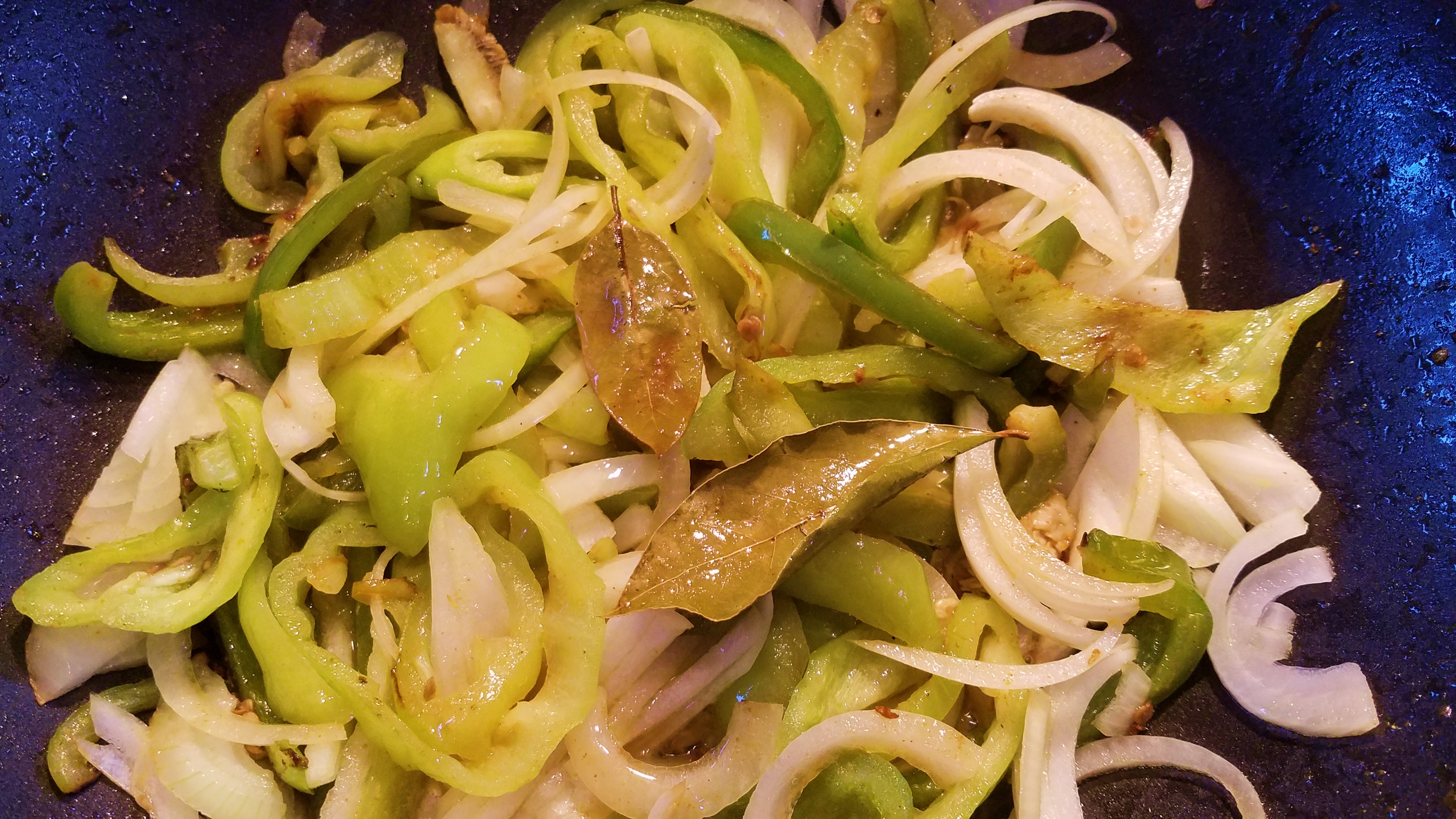 La chair de l’oignon était naturellement blanche. Par contre, la paroi du wok nous a fait la surprise de présenter des reflets bleus, comme pour rappeler à ceux qui dégusteraient avec les papilles ou avec les yeux qu’il s’agissait là d’une façon de faire complètement cycladique.