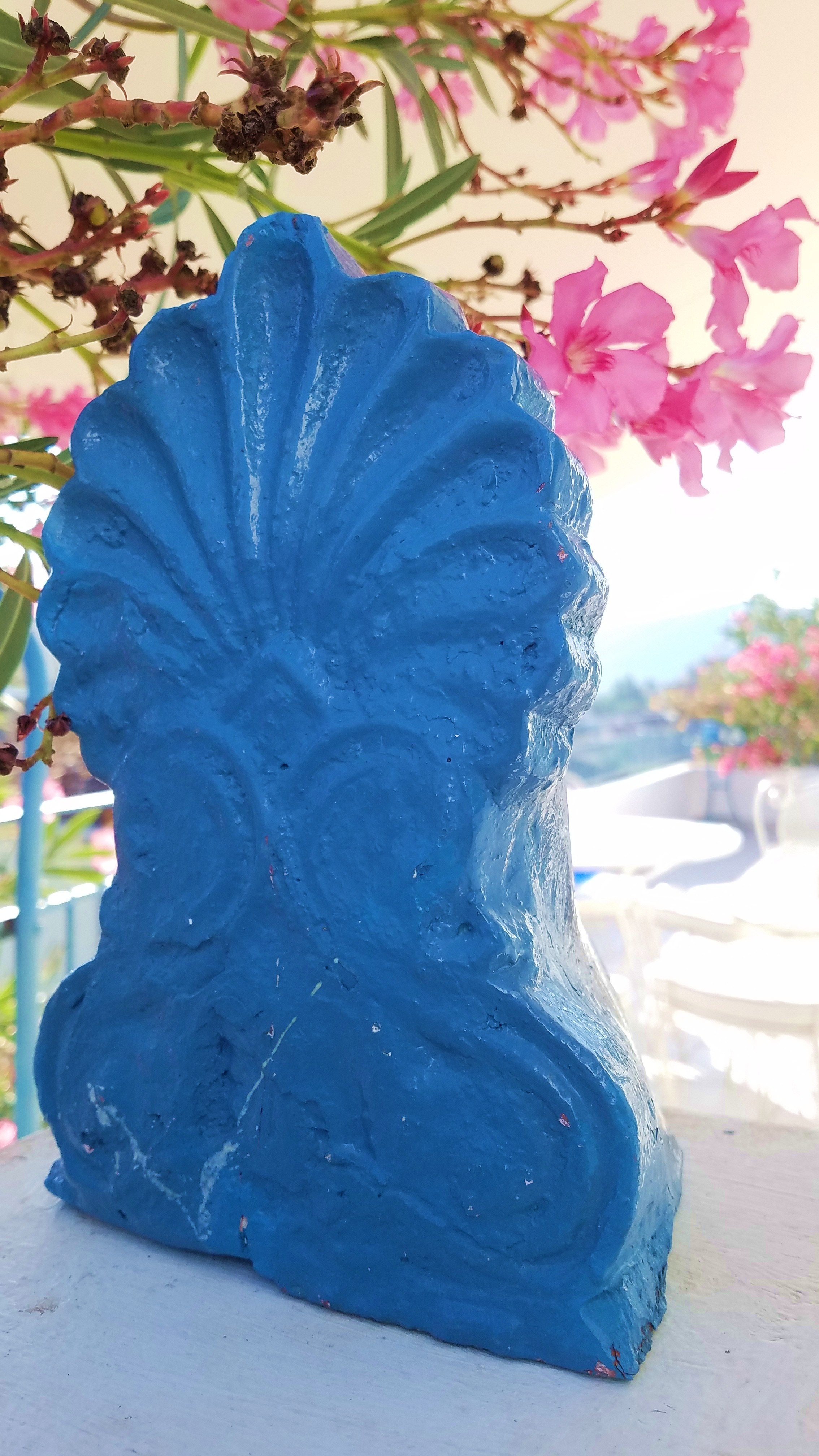 Pour le visiteur qui s’approchait de la maison, la palmette ocre se trouvait à droite. S’il se montrait vigilant et attentif, il verrait sans nul doute que l’inflorescence traditionnelle avait une sœur, bien cycladique, toute vêtue de bleu. Celle-ci se tenait cachée, sous le laurier rose qui grimpait du sol jusqu'au balcon de la mer. Voici la coquette, qui jouait à la discrète :