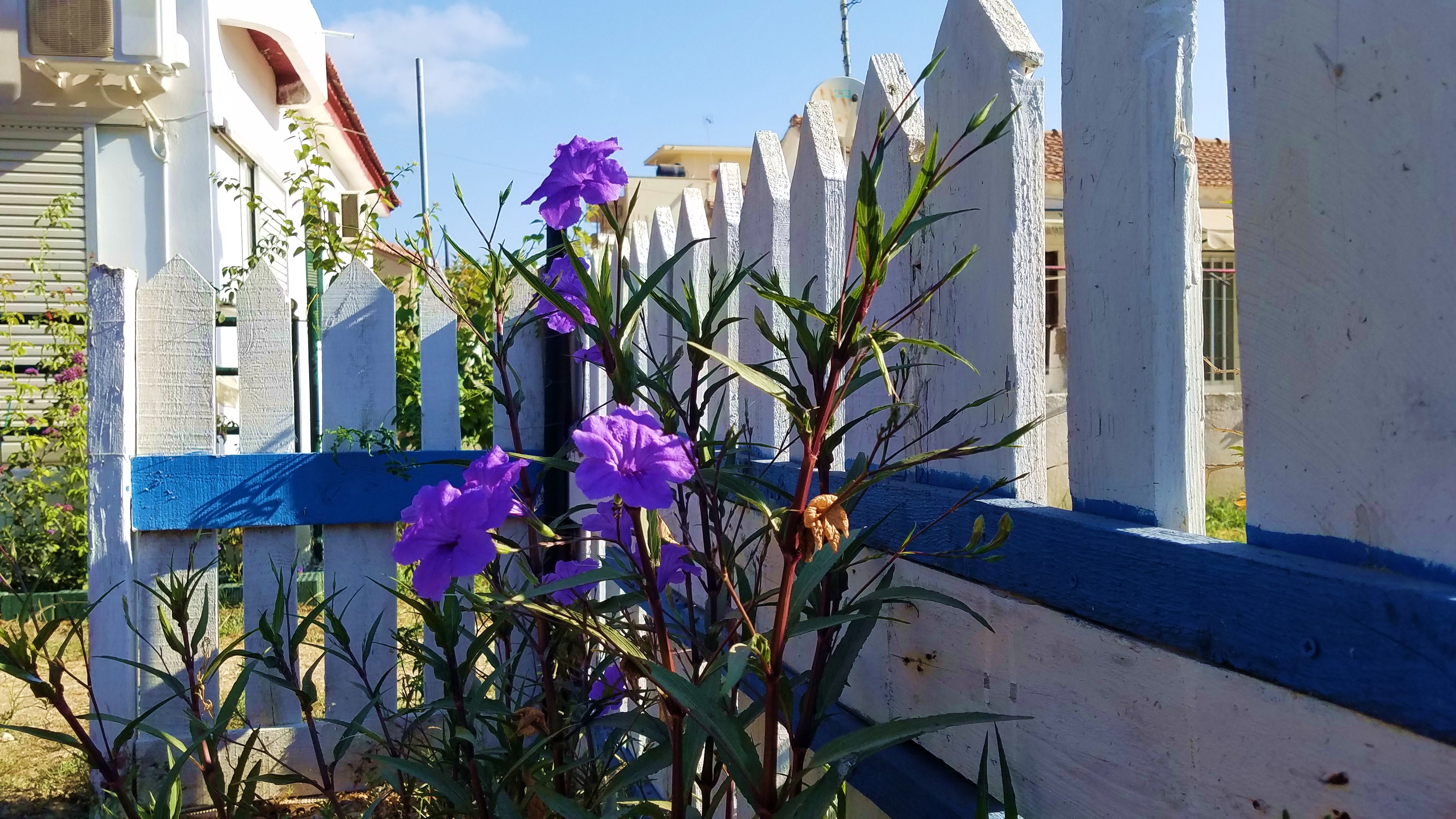 La haie en bois était composée de segments verticaux blancs et de segments horizontaux bleus. Devant ce bichromatisme classique, se dandinaient des corolles mauves. Mais qu'était-ce ce mauve ? C'était tout simplement du bleu courtisé par la lumière dorée du soleil couchant.