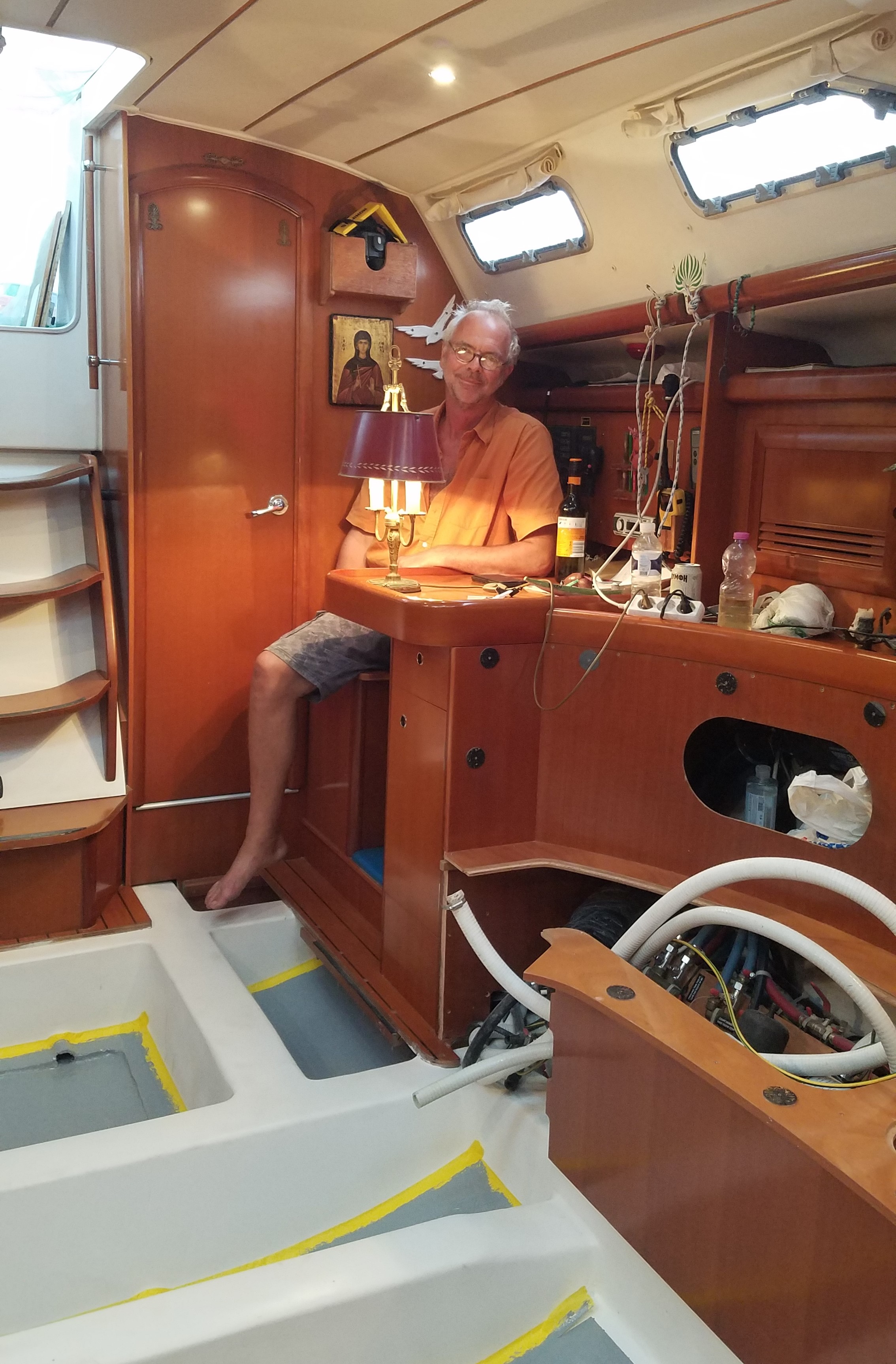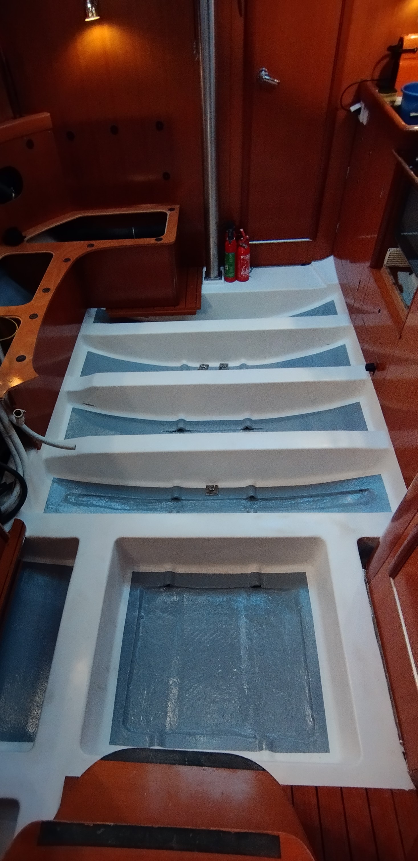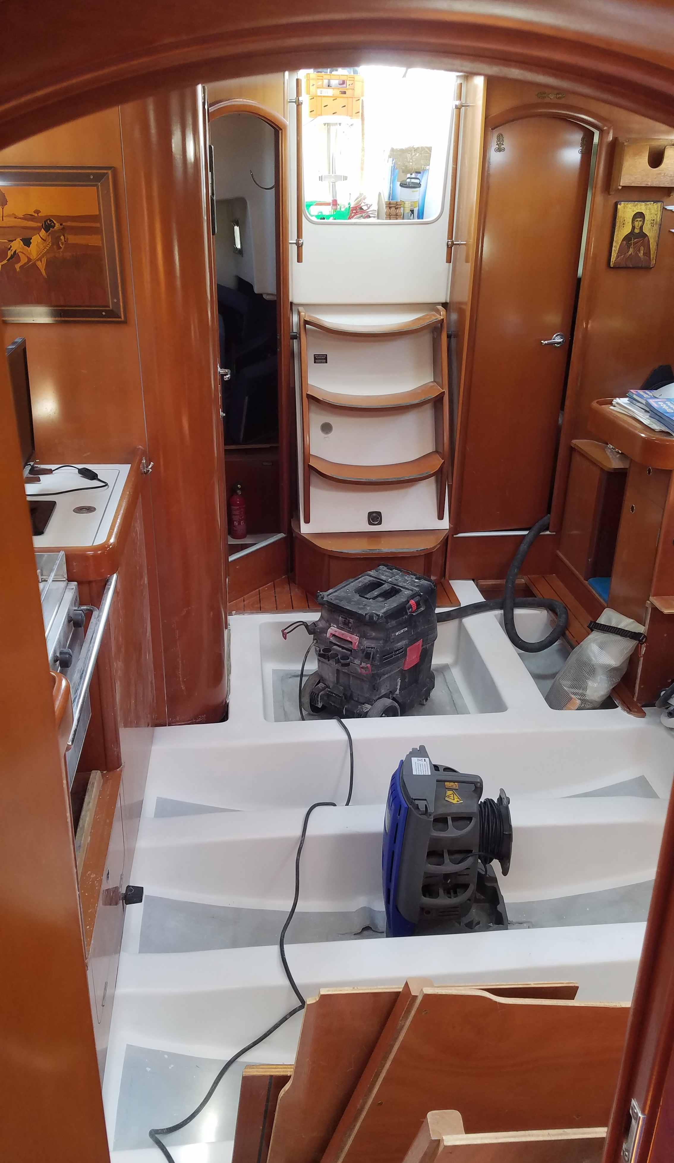 Je démonte tous les planchers dans toutes les cabines et jusque dans la soute, pour chasser la moindre particule de poussière. J'en profite aussi pour faire un grand coup de propre avec savon sans compter...