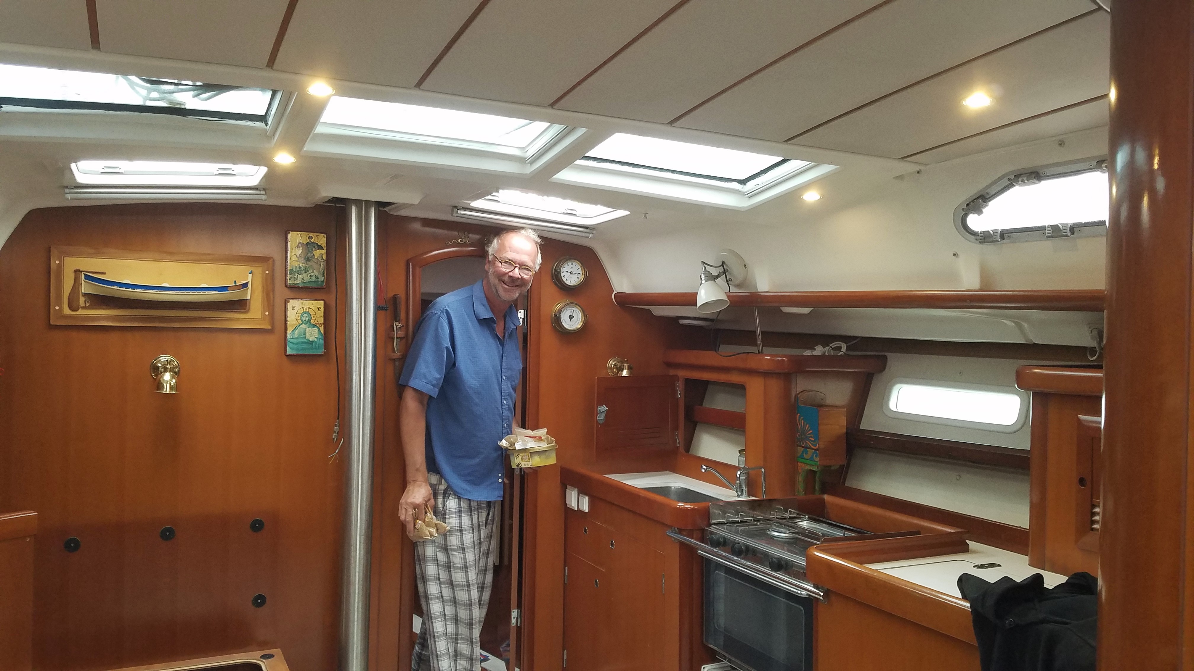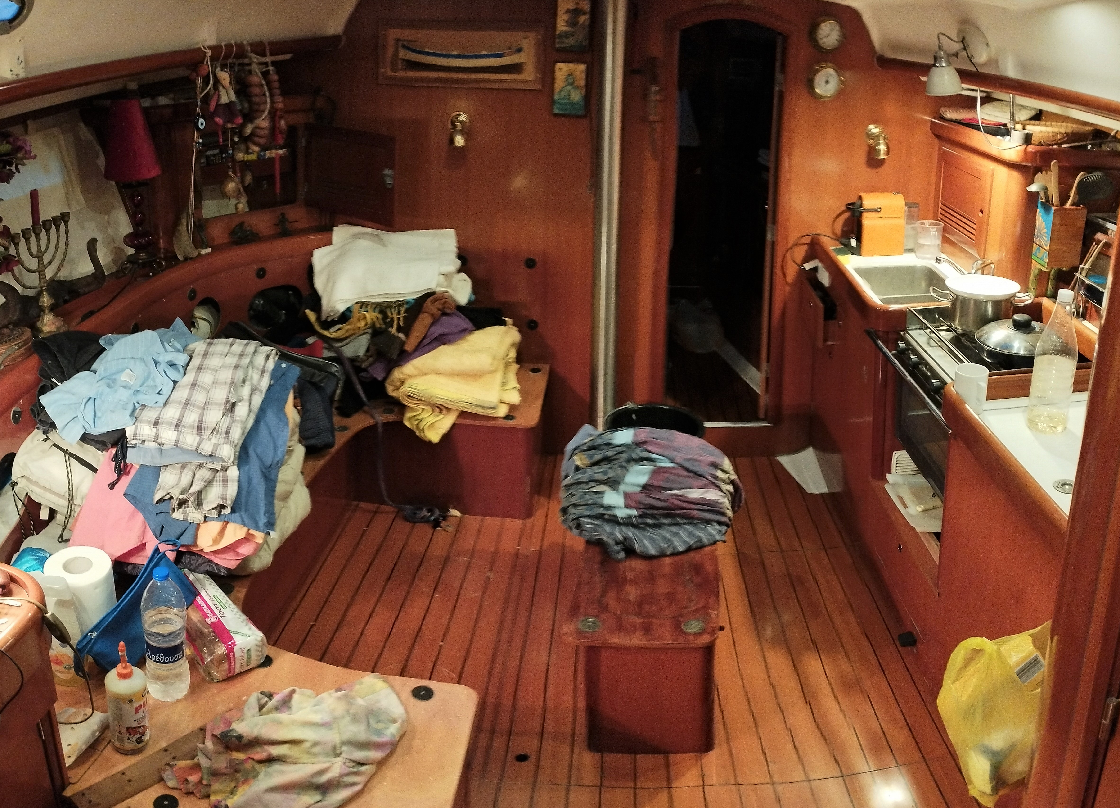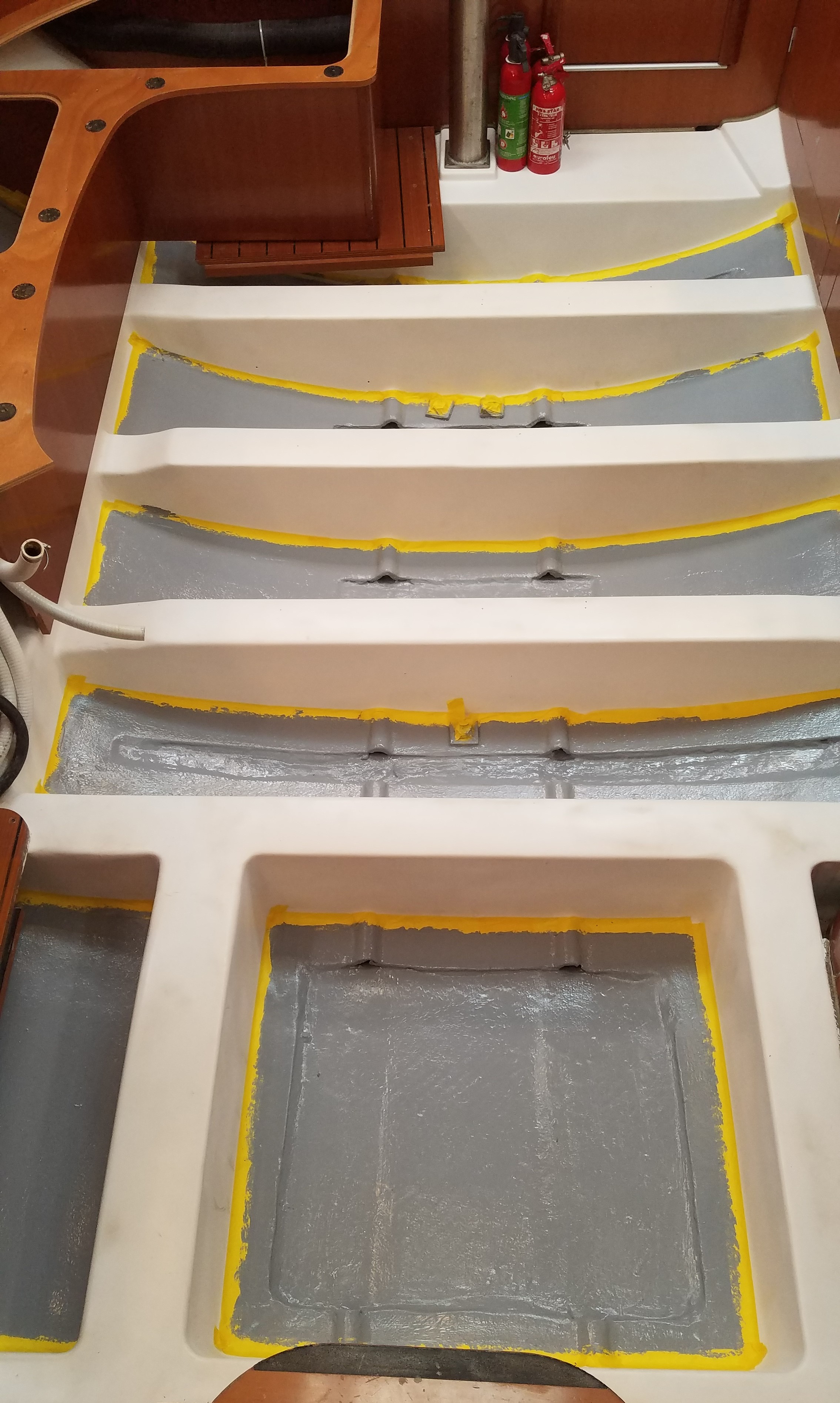 Je démonte tous les planchers dans toutes les cabines et jusque dans la soute, pour chasser la moindre particule de poussière. J'en profite aussi pour faire un grand coup de propre avec savon sans compter...