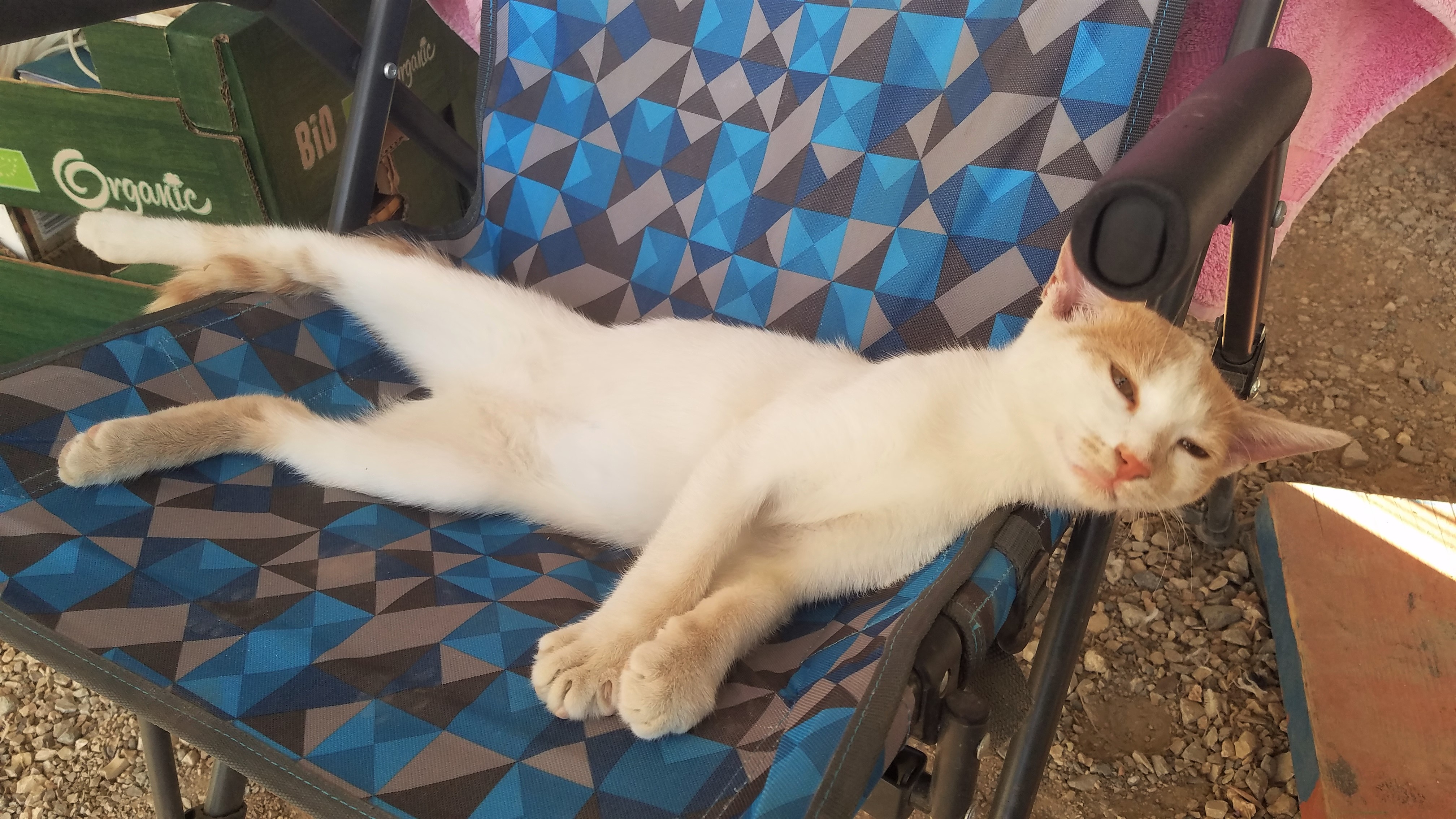 Depuis, elle se prélasse sur nos fauteuils de camping, trouve asile la nuit dans nos vêtements posés dehors en attente de lavage, jusqu'à s'allonger de tout son poids et de toute sa longueur dans tous les nids qu'elle trouve : Caissettes de légumes, glacière entrouverte, voile de taud, et jusque sous la toile de tente, à l'abri du vent...