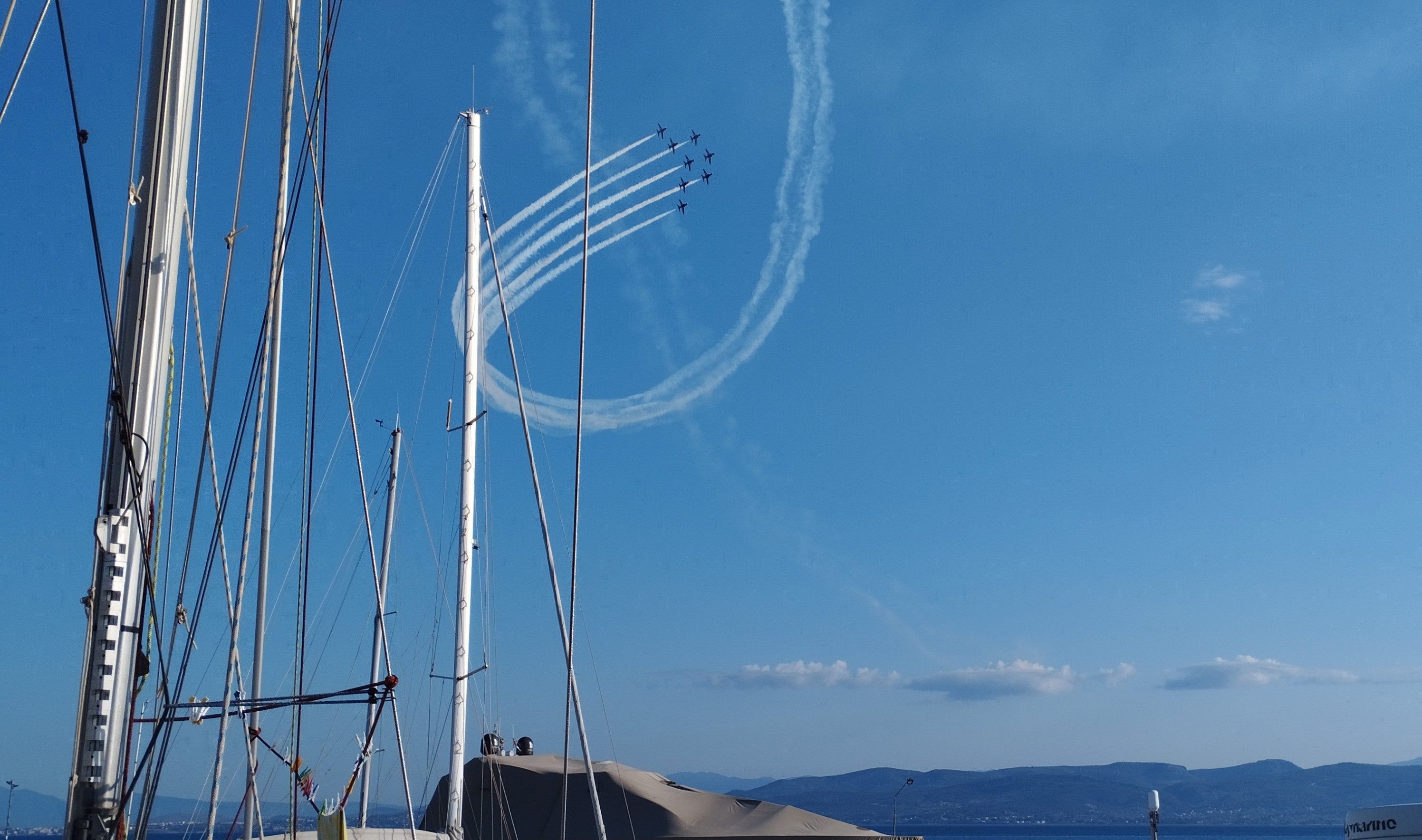 Tous ces jours de patience sont interrompus, chaque matin de la semaine, à 8H10 précisément, par le ballet de la patrouille aérienne de Grèce. Ils s'entraînent à pirouetter et à virevolter juste devant le chantier. Spectacle garanti !