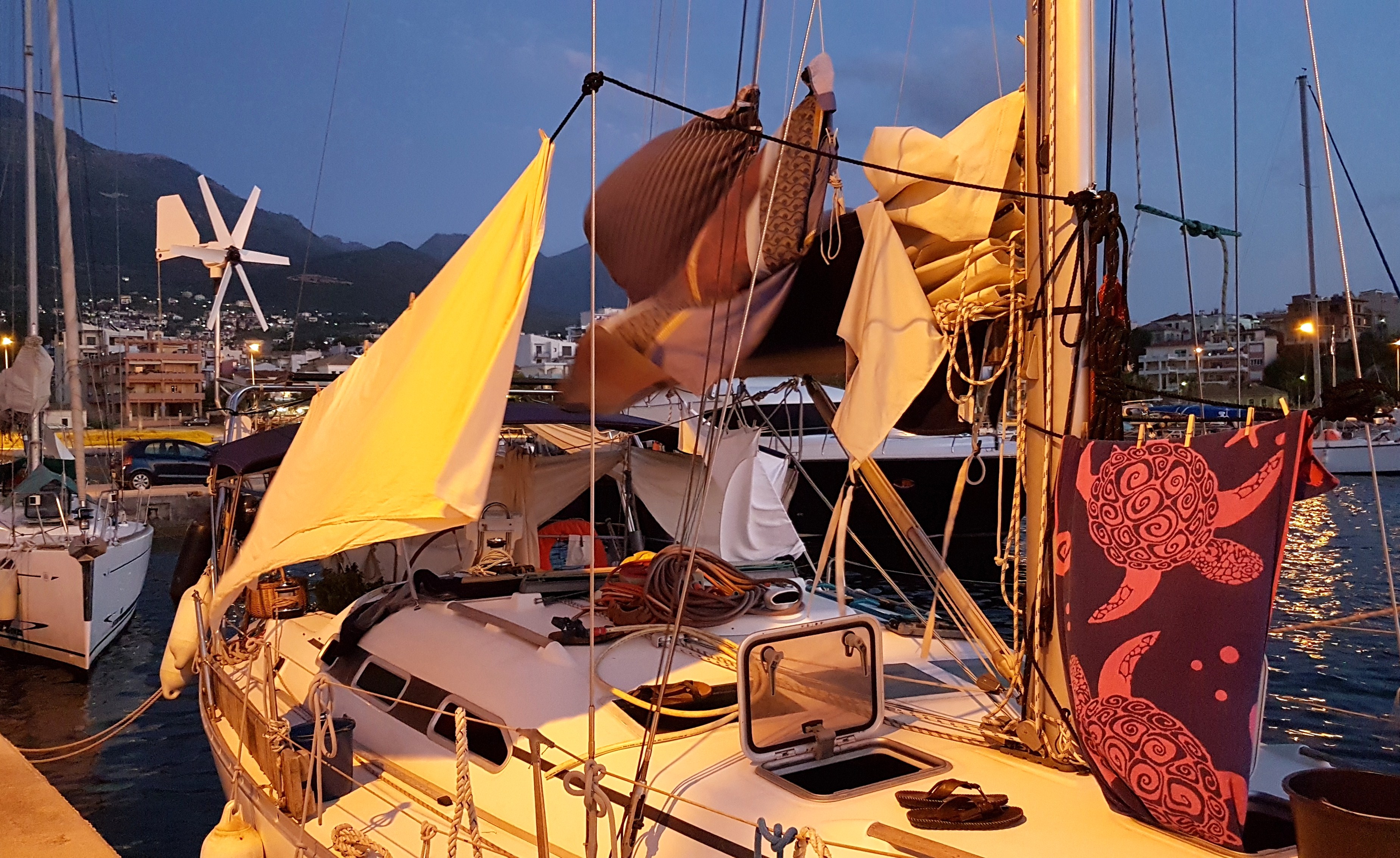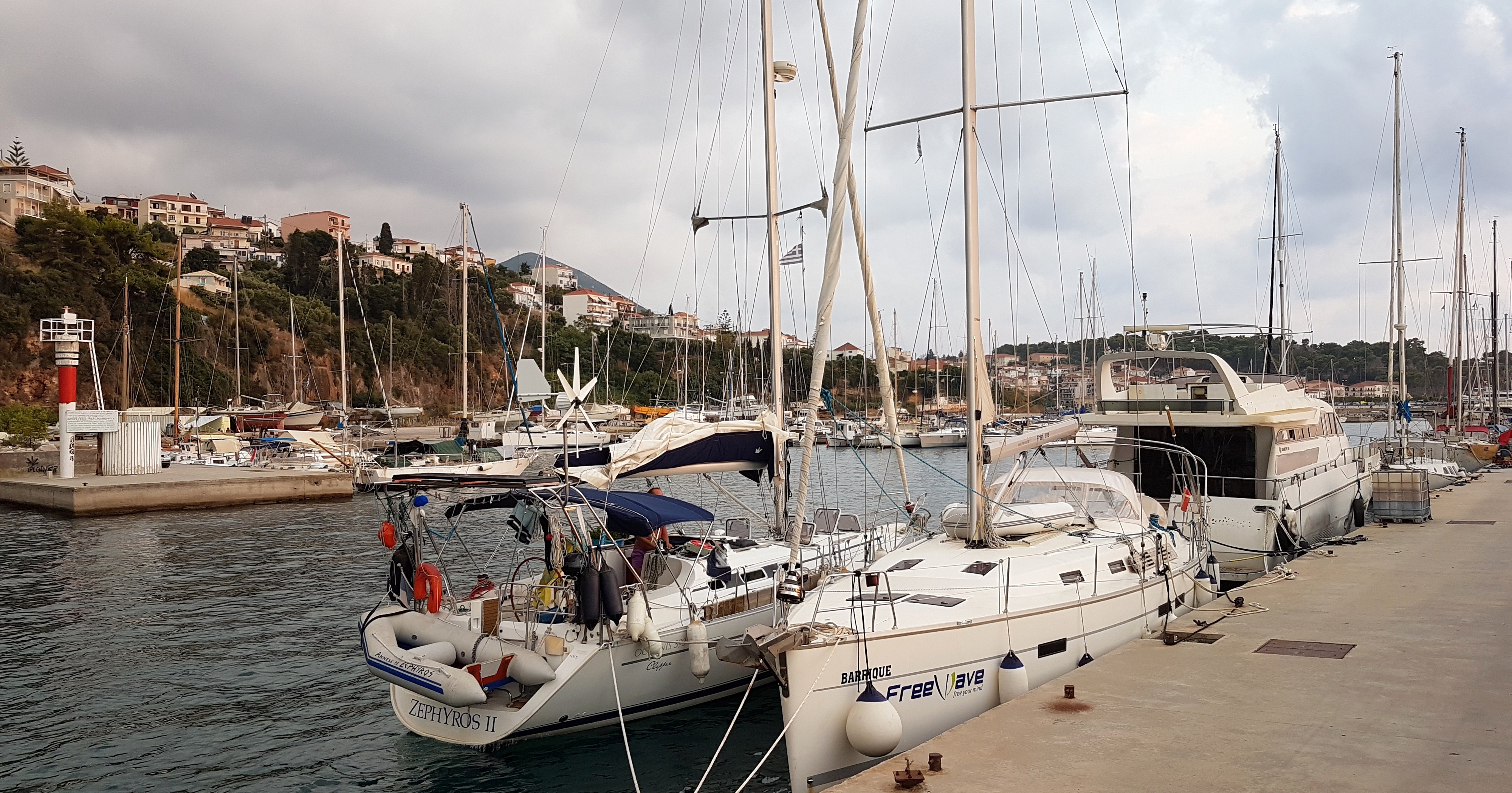 Et c'est au bout de 7 jours qu'on a mis les voiles pour gagner la non moins plaisante bourgade de PYLOS. Ici, le port est embouteillé de bateaux-ventouses... Chacun d'eux s'étant octroyé un bout du quai... Il ne nous reste plus que l'option à couple !